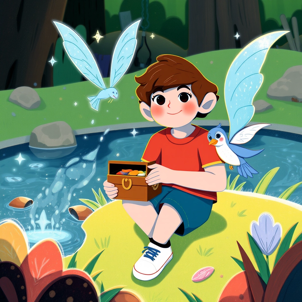 [David](7P3GKFC6) and [Azura](FQ4TK9C4) reached the sparkling pond when a sudden gust of wind whooshed past, trying to carry [Azura](FQ4TK9C4)'s treasure chest away. [David](7P3GKFC6) ran as fast as he could after it!