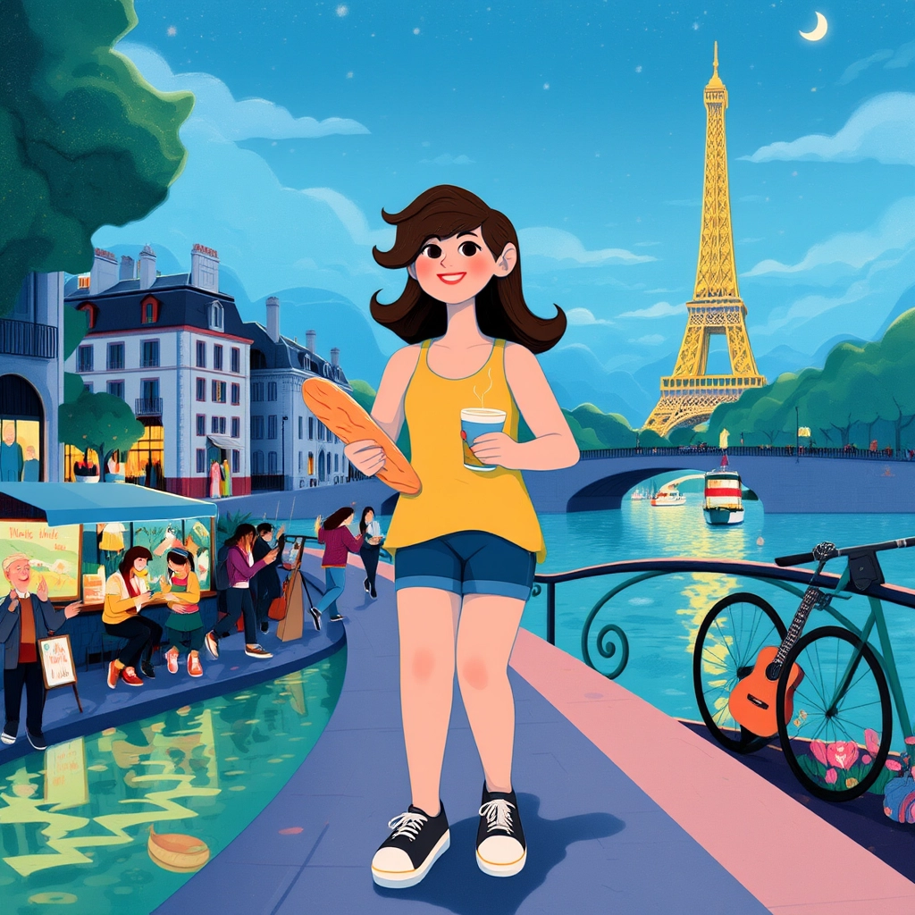 Proudly clutching her baguette and coffee, [Girl](PXQT5J27) explored the streets of Paris. She marveled at the river Seine, the intricate balconies on the old buildings, and the street performers who twirled and played accordions. Her heart raced as she realized just how far her dreams had taken her.
