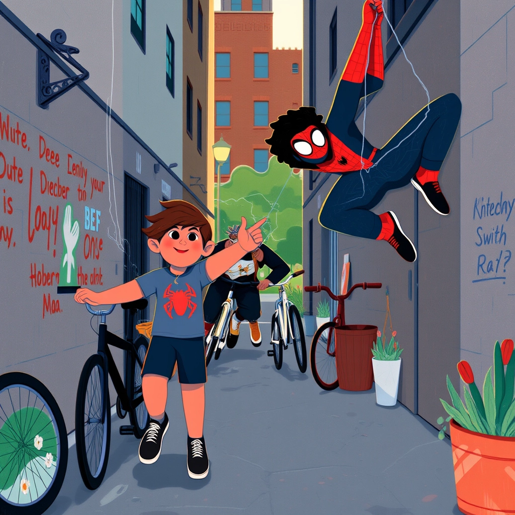 Suddenly, a web swung down from the sky, and [Miles Morales](WDSD3ZZR), the real Spider-Man, landed right in front of [Dee-Jay](H3TSSPB5)! 'Hey, I'm Miles. I'm looking for someone brave to help me today. Wanna join?'