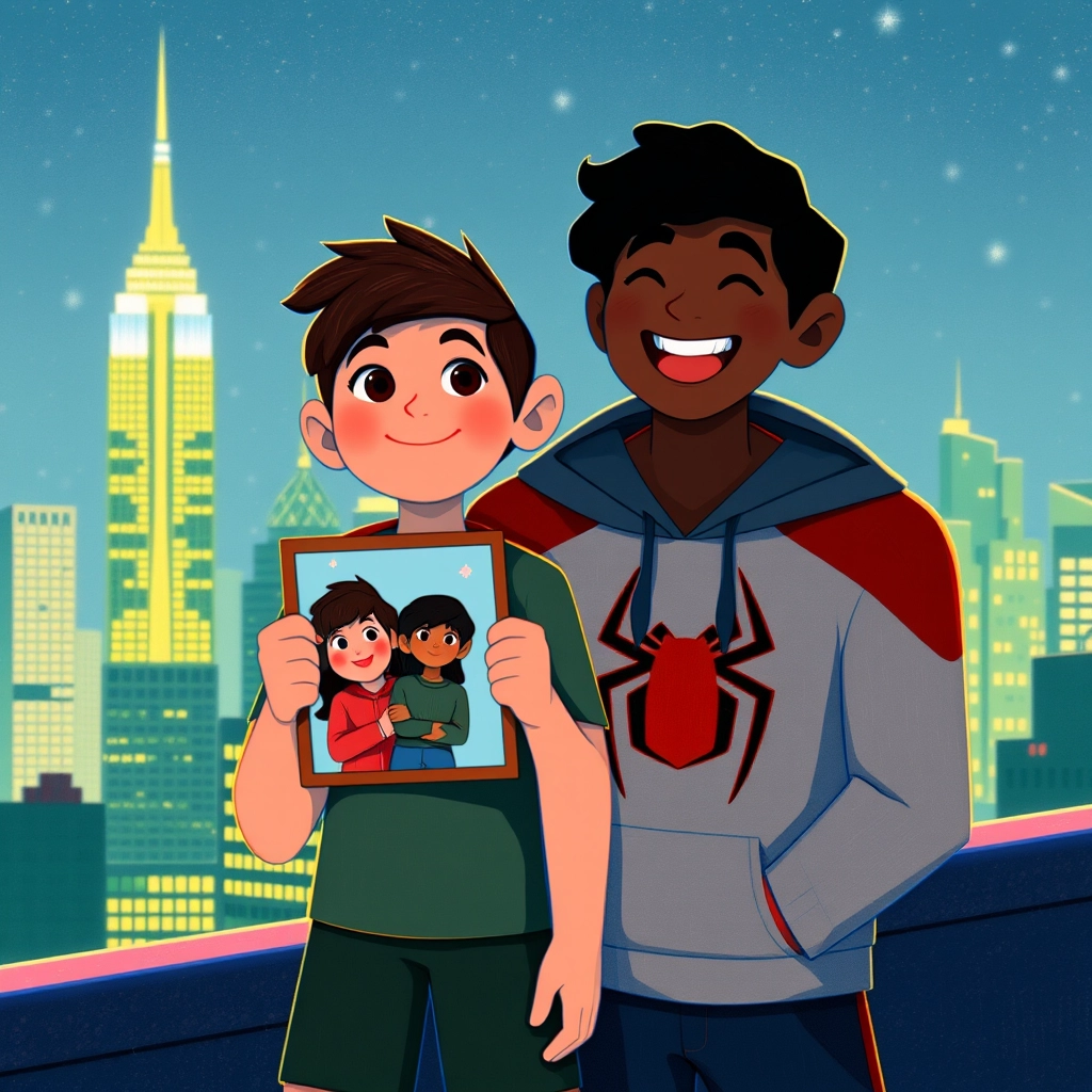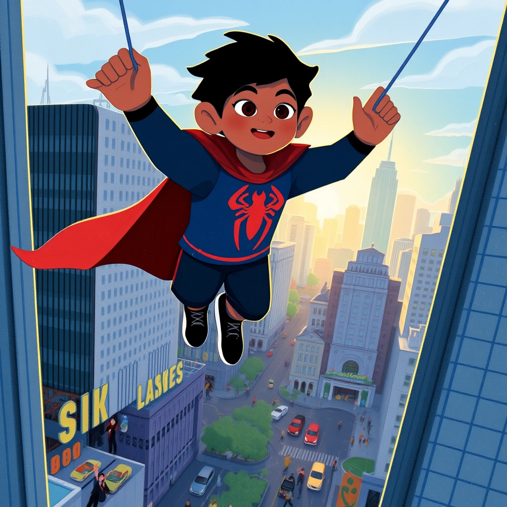 'Let's go!' said Miles as they swung through the city on Spider-Man's webs. [Dee-Jay](H3TSSPB5) felt like he was flying, holding onto Spider-Man tightly.