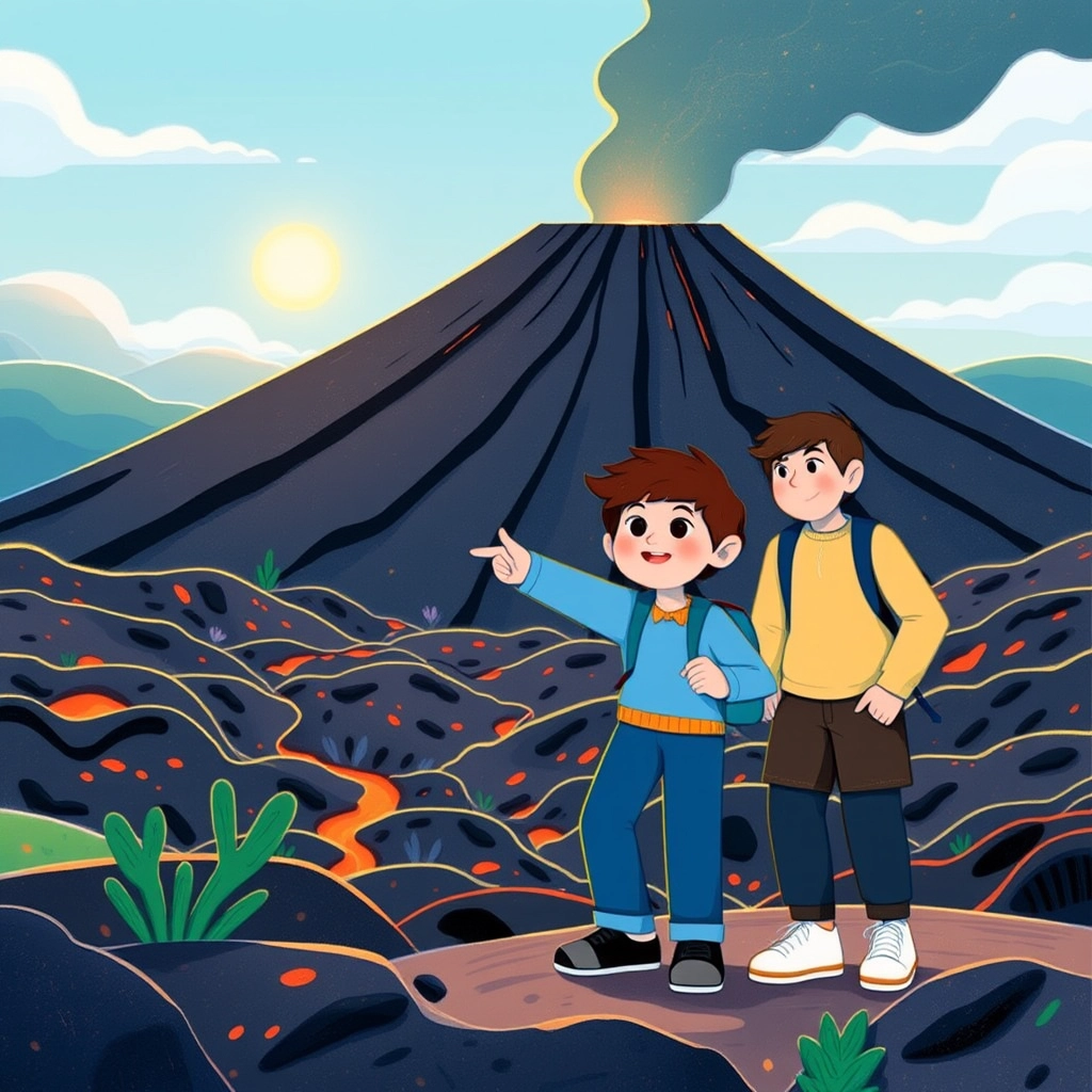 The next day, [Dennis](WZM2FGVM) explored Hawaii's volcanic wonders. He stared in awe at a volcano and the black lava rock fields that sparkled in the sun.
