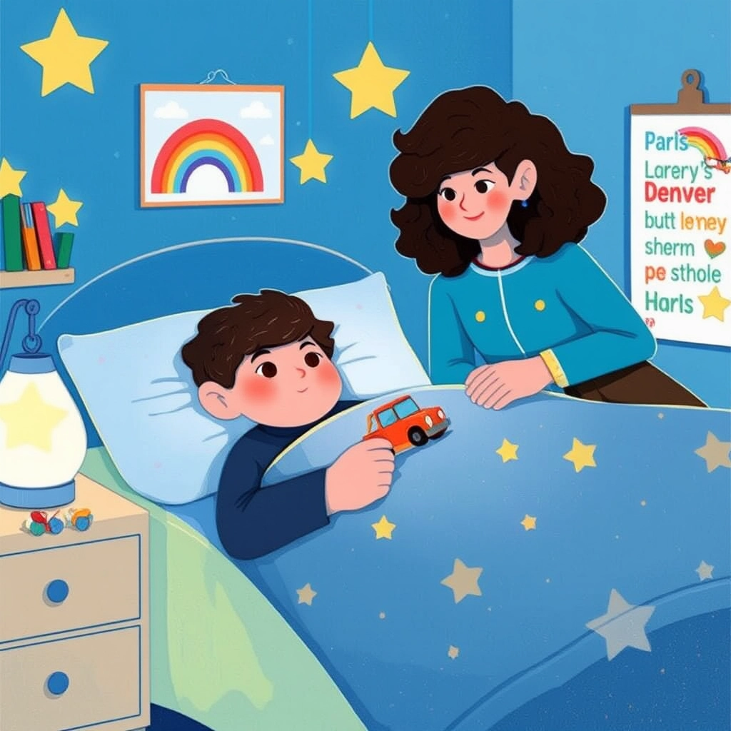 That night, as [Denver](N3RWT4JB) climbed into bed, [Paris](JRBYL55J) tucked him in. ‘Tomorrow, you get to explore even more of your brave purple feelings at school,’ she said. [Denver](N3RWT4JB) giggled. 'I can't wait!' Together, they said goodnight, and [Denver](N3RWT4JB) dreamed of rainbows and new adventures.