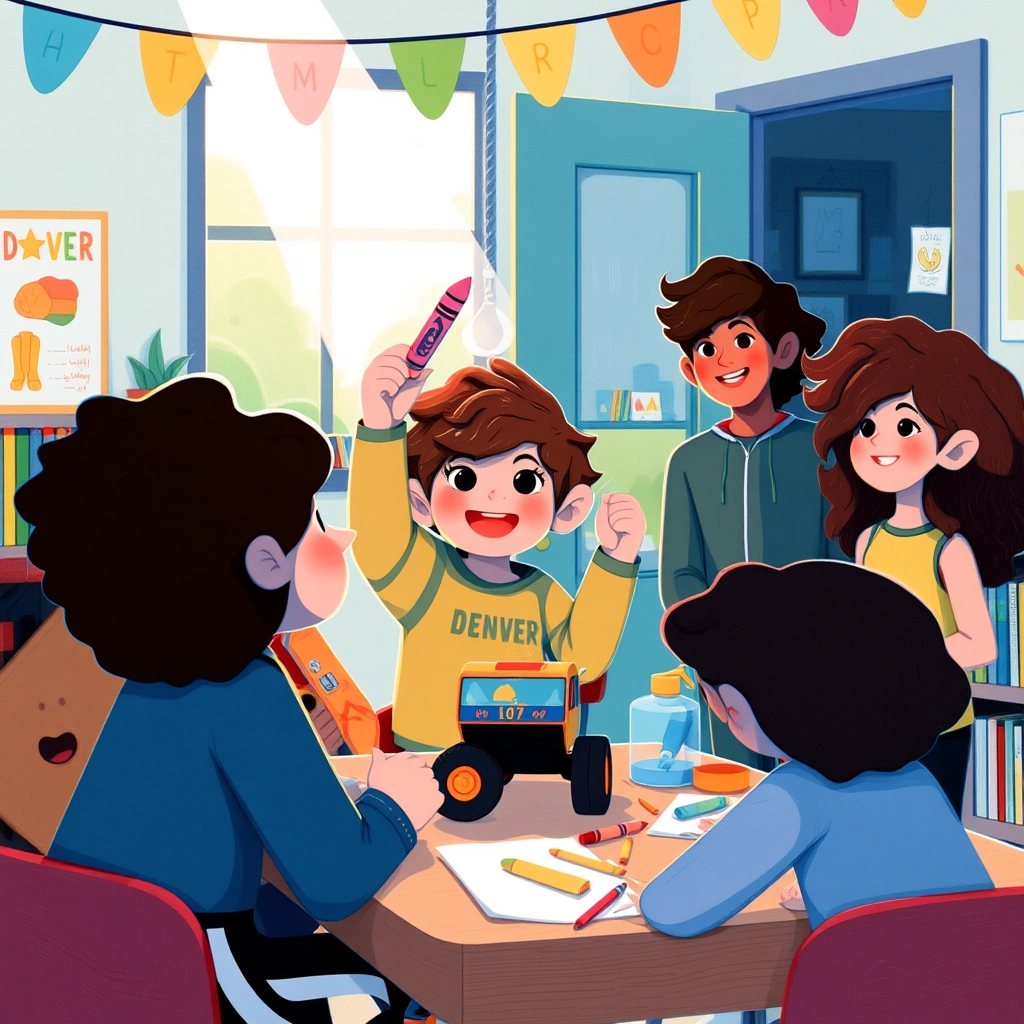 By the time snack time arrived, [Denver](N3RWT4JB) had colored, built a robot with blocks, and played with his toy truck. ‘You made so many new friends already!’ [Paris](JRBYL55J) said when she came to pick him up. [Denver](N3RWT4JB) ran to her, his smile as bright as the sunny day outside.