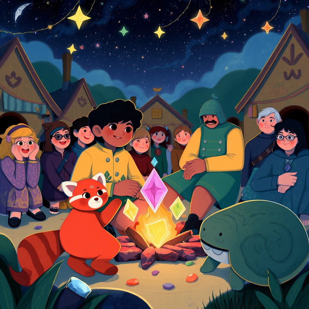 The Whispering Tree rewarded them with a treasure box filled with glowing gems of wisdom and joy. [Dhanura](W7W67522) realized these were more valuable than any gold, as they sparked feelings of happiness and understanding.