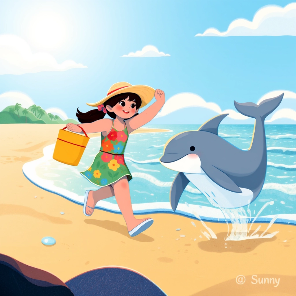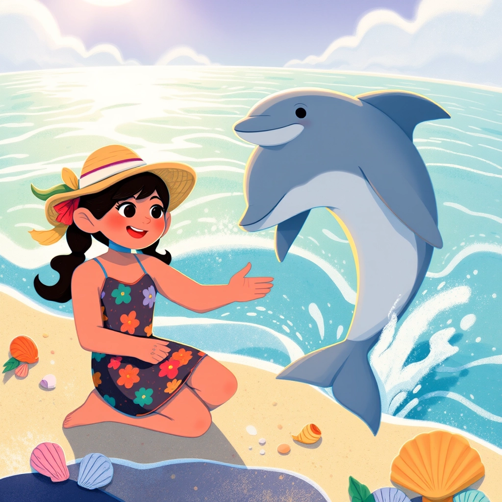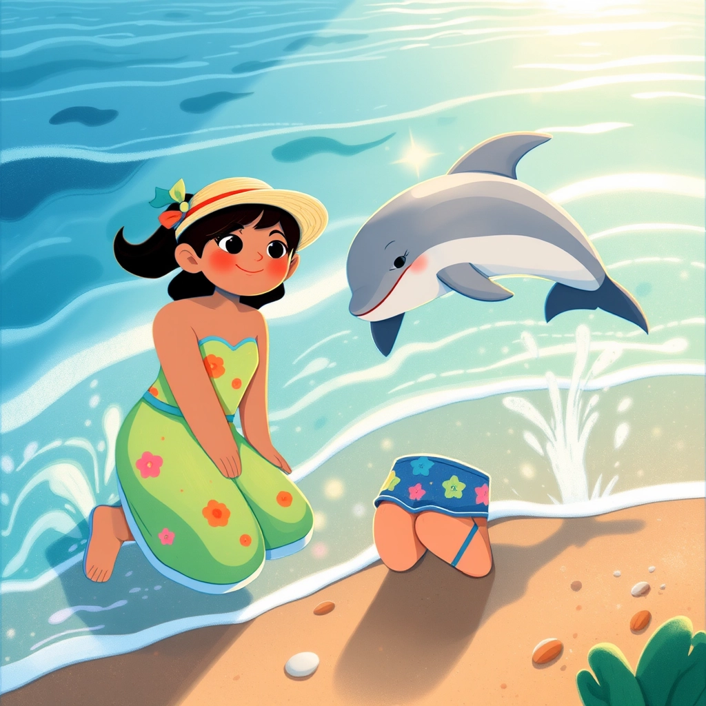 Just as [Dhivisha](SWHKPCZN) reached the water, a dolphin named [Sunny](CXZB4V9T) splashed up and made a cheerful squeak! [Dhivisha](SWHKPCZN) smiled and waved her hand excitedly.
