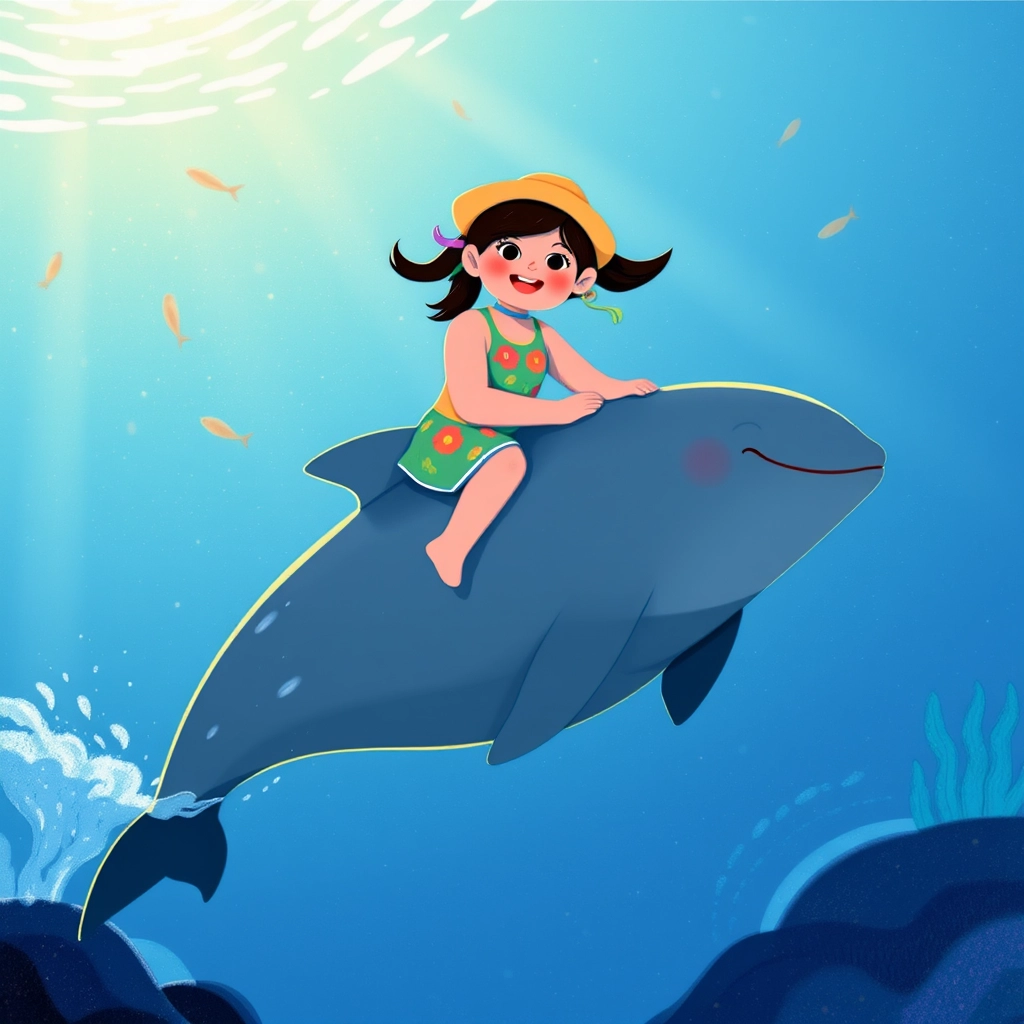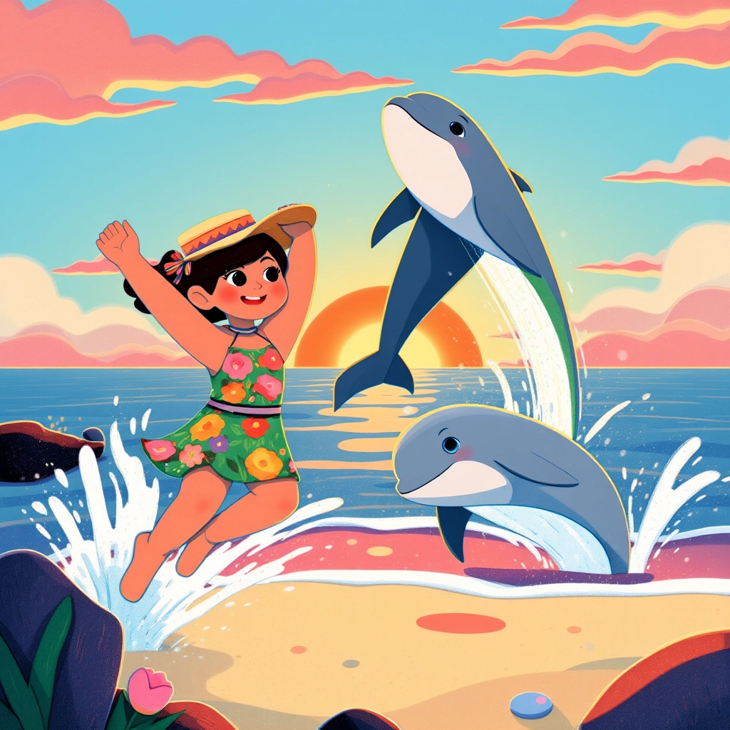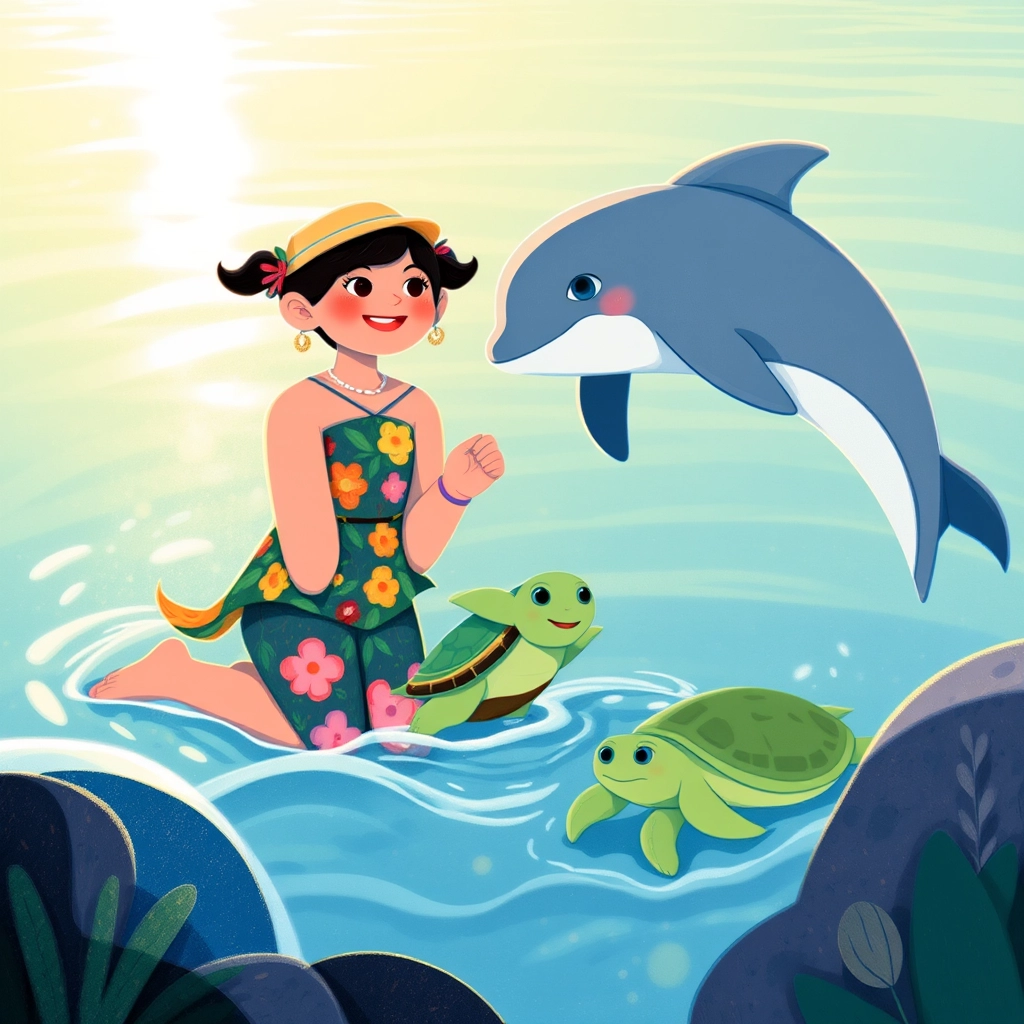 Just as [Dhivisha](SWHKPCZN) reached the water, a dolphin named [Sunny](CXZB4V9T) splashed up and made a cheerful squeak! [Dhivisha](SWHKPCZN) smiled and waved her hand excitedly.