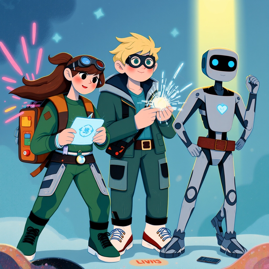 Amid this wonderous city lived three friends: [Mia](JF3LX3KQ), a tech-savvy girl with a backpack full of gadgets, [Leo](RF9JTPXW), an aspiring inventor with energy to spare, and [Pixel](245GY4K2), their friendly robot companion.