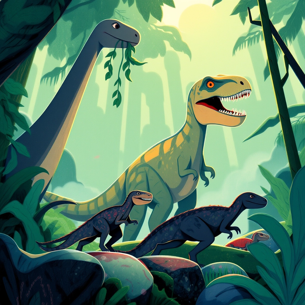 But danger lurked in the forests too! Ancient dinosaurs roamed these lands. From swift raptors to huge herbivores and the fearsome T-Rex, the world was alive with creatures from another time.
