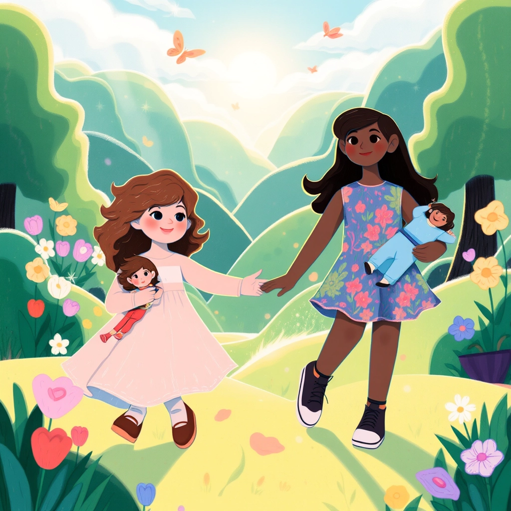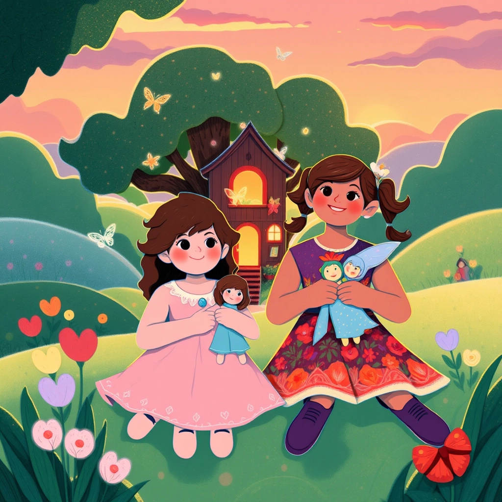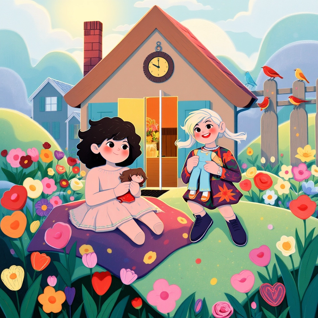 Once upon a time, two sisters, [Divine](2SC44JZQ) and [Elikya](9MC4HYV2), lived in a cozy house surrounded by a flower-filled garden. They loved playing with their dolls and spending time together every day.