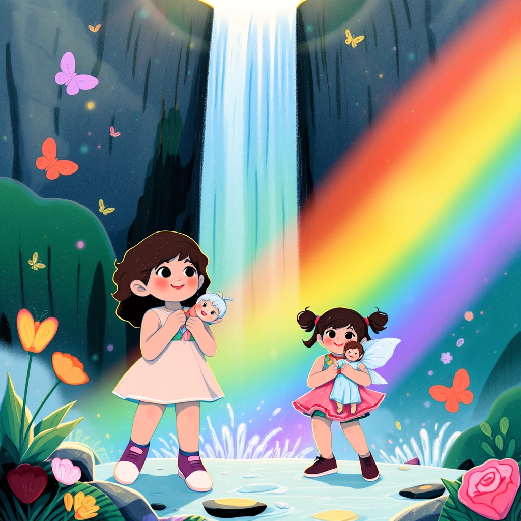 The sisters closed their eyes and made a wish together, 'Let us always have joyful adventures and stay sisters for life!' The waterfall sparkled even brighter as if granting their wish.