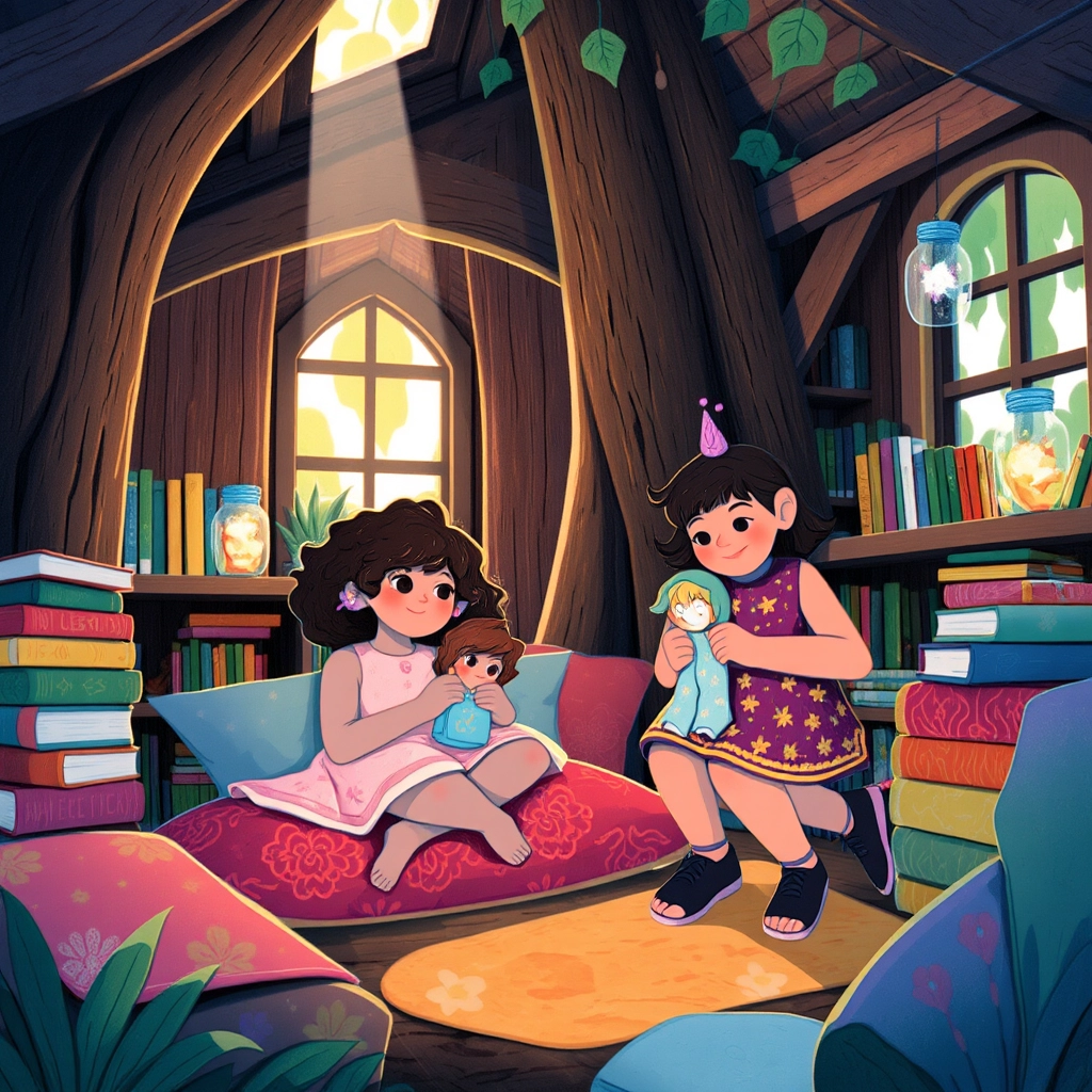 The butterfly led them to the treehouse. Inside, they found stacks of books, colorful cushions, and sparkling jars filled with glowing lights.