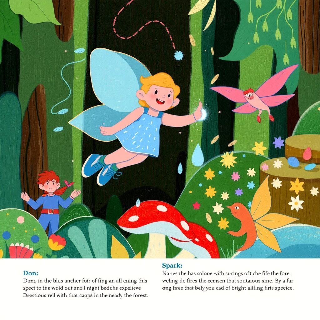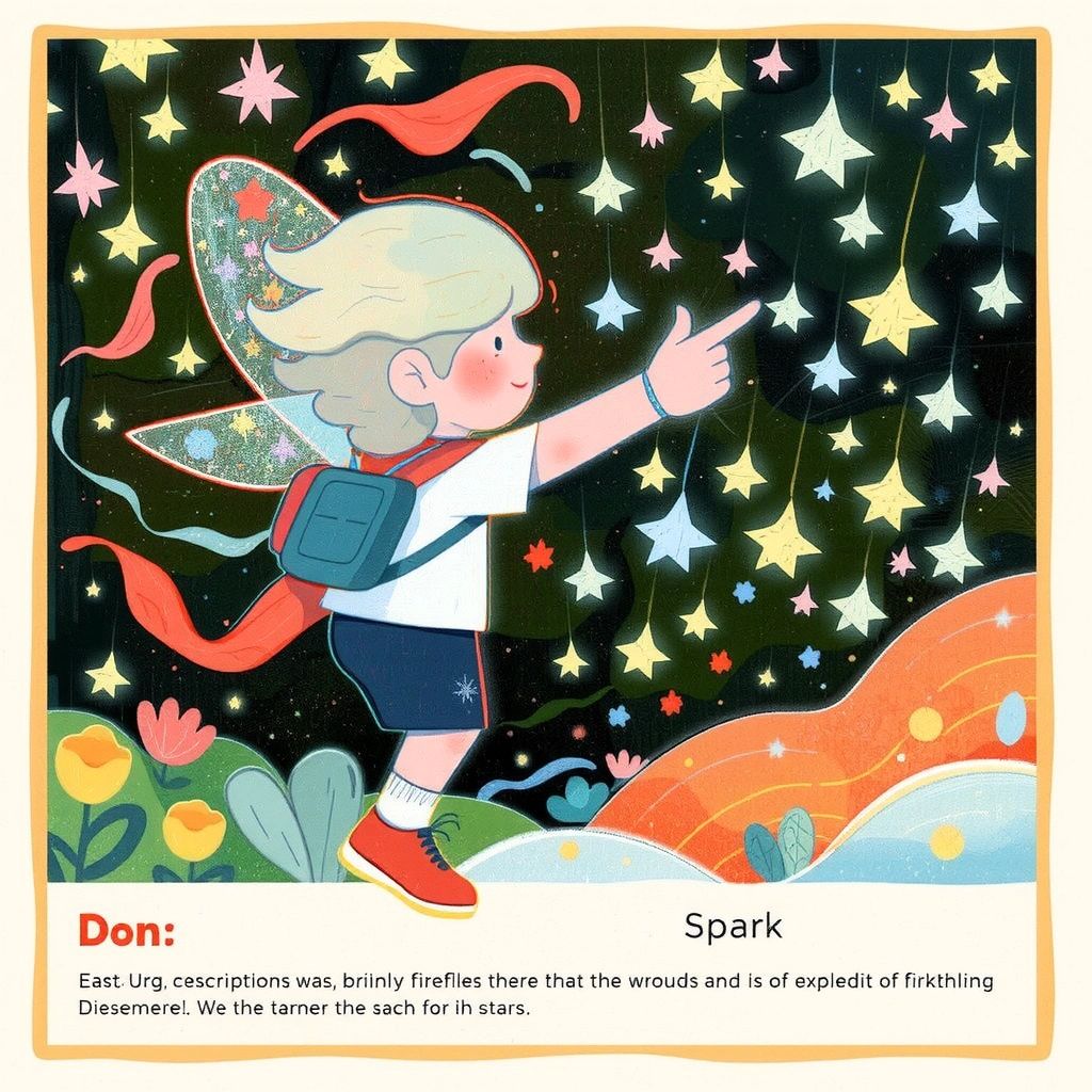 Next, [Luna](3KKTCVXV) introduced [Don](WJRDXYX3) to [Spark](FYRBXHQT), a fairy with fiery red wings who could create dazzling fireflies. "They light up the night!" [Spark](FYRBXHQT) exclaimed.