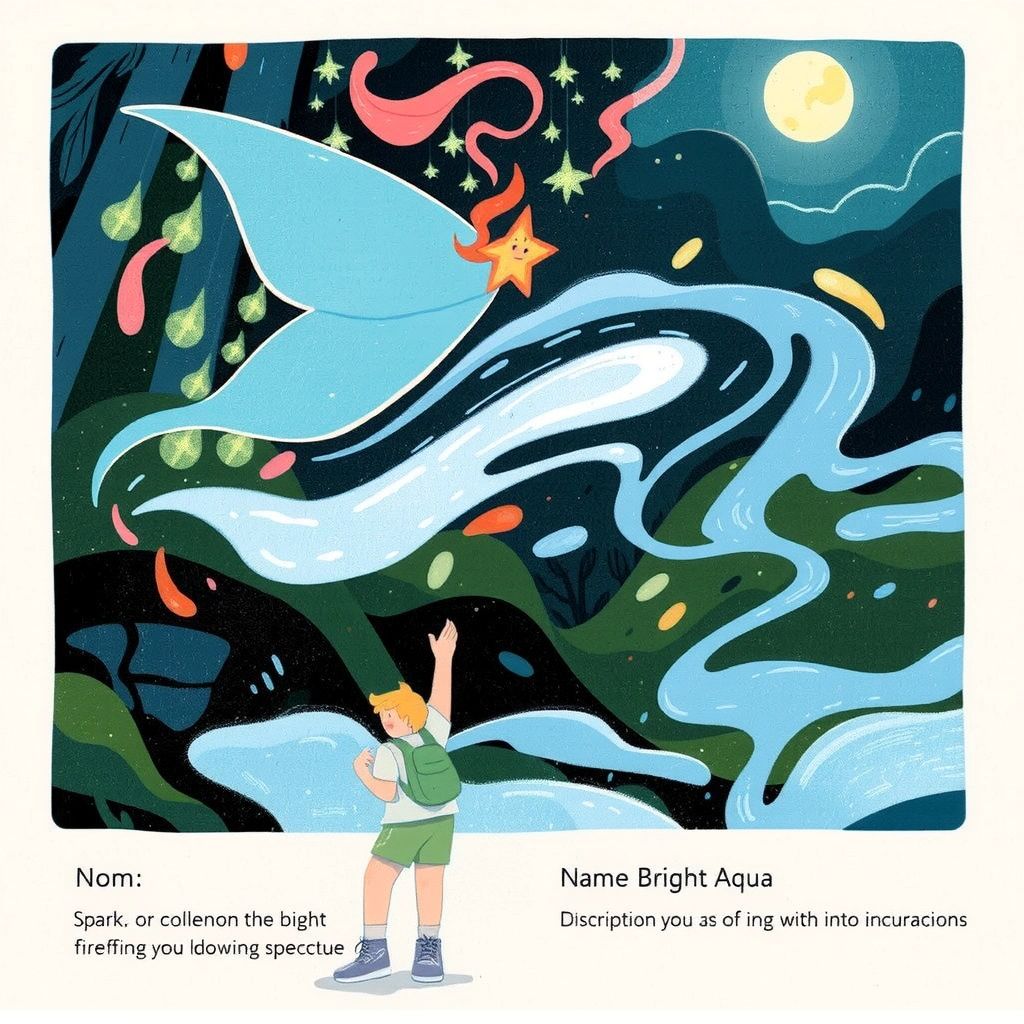 By the shimmering brook sat [Aqua](62RYCMH9), a fairy with turquoise wings. She spread her hands and the water danced in the air, forming shapes and patterns.