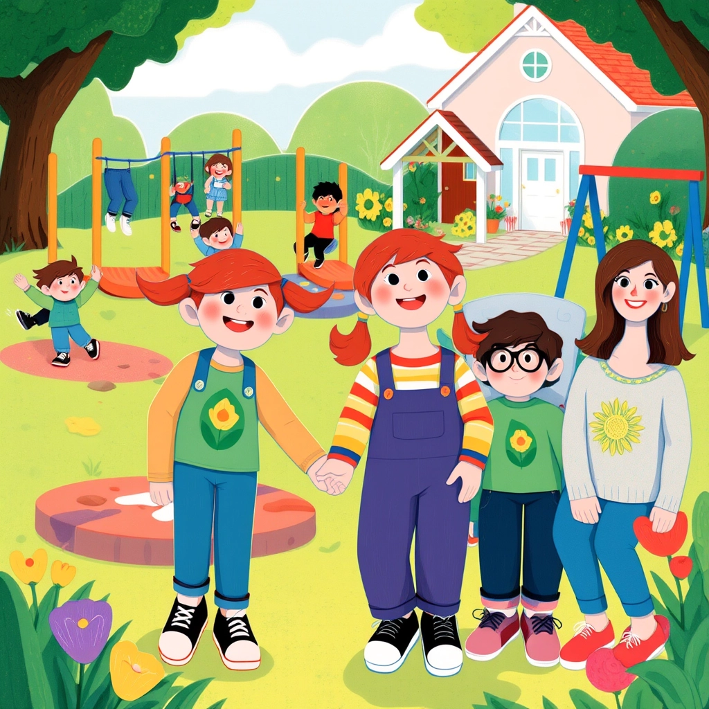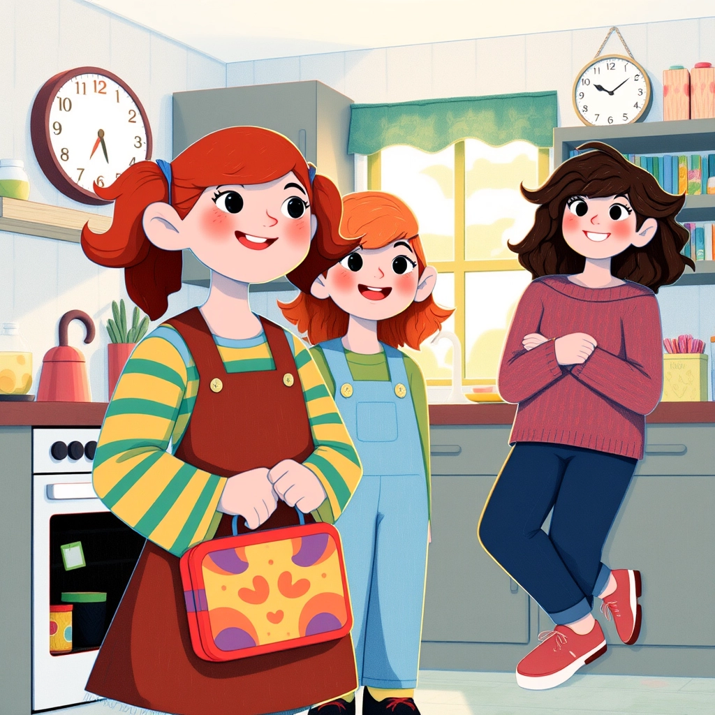 It was Monday! Kindy Day! [Dottie](HSCPNN9Z) had red hair, ponytails, a freckly face, and a big gap where her front tooth used to be. She was excited for kindy—but also a little nervous. “What time will you get me?” she said to [Mum](2S9QRL75), she also wondered. “And what if [Eli](V9L9J4CD) steals my lunch?”