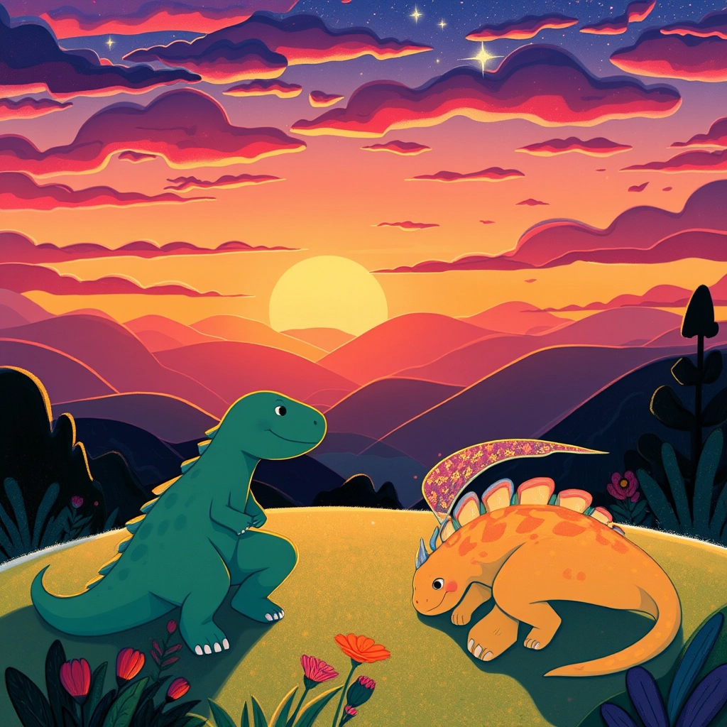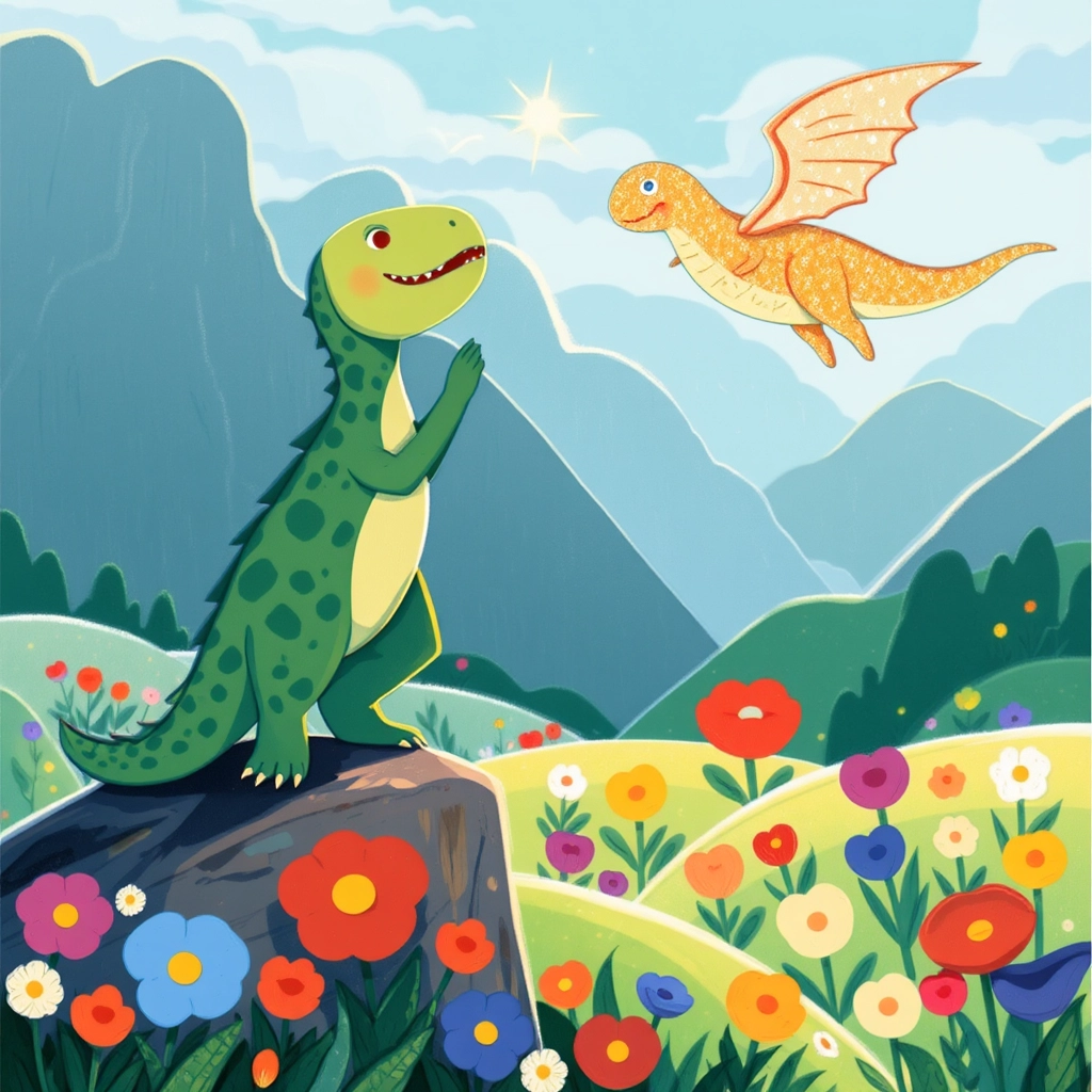 One day, [Rexy](FFL6SQL7) looked up and said, '[Glimmer](3LXNJLC5), let's go on a big adventure to where dinosaurs and dragons meet!' [Glimmer](3LXNJLC5)'s eyes sparkled. 'That sounds amazing!' she replied.