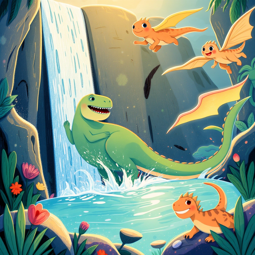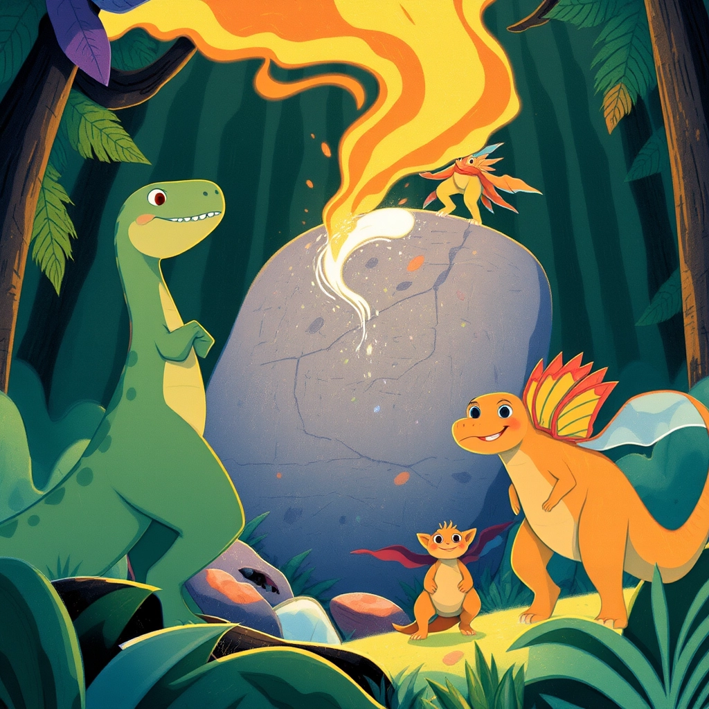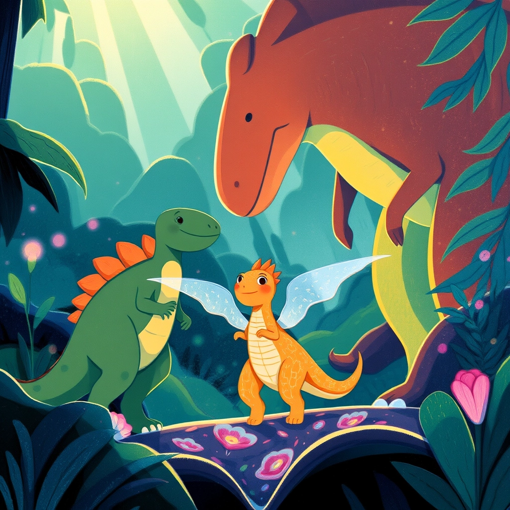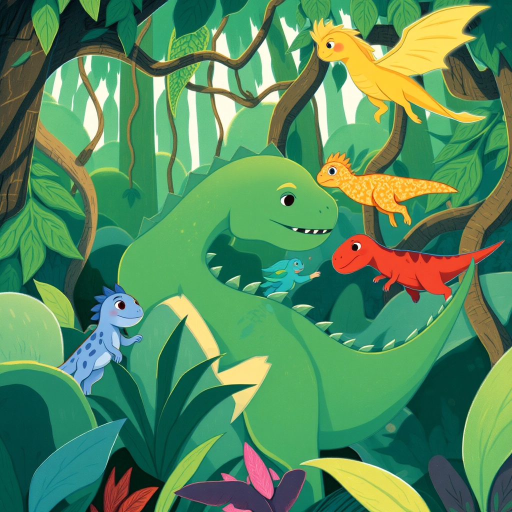 Together, they traveled through a dense jungle, where little dinos peeked out from the ferns, and dragonflies buzzed around curiously.