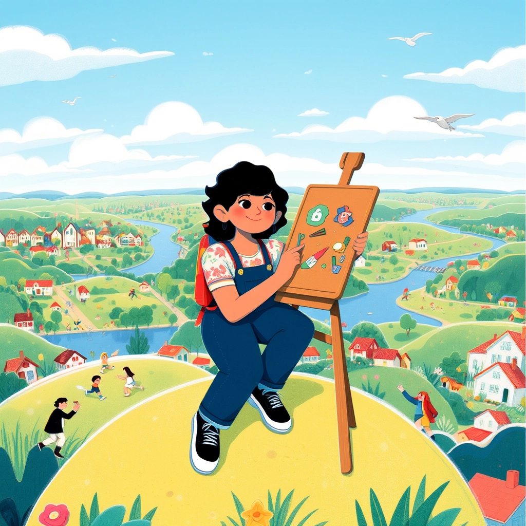 Her painting was almost done, but something was missing. She grabbed her favorite blue paint and added herself, standing proudly in the picture next to [Whiskers](R6VZXTJG).