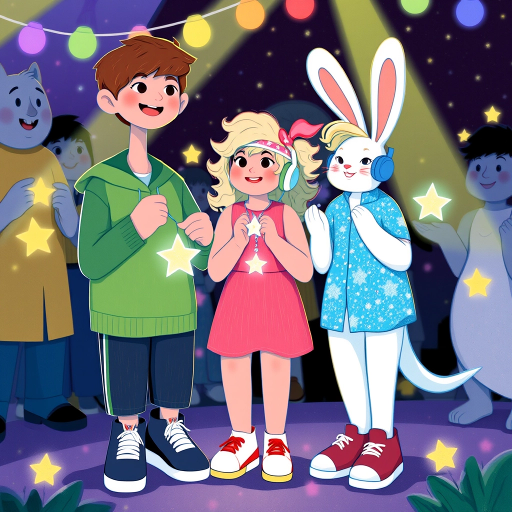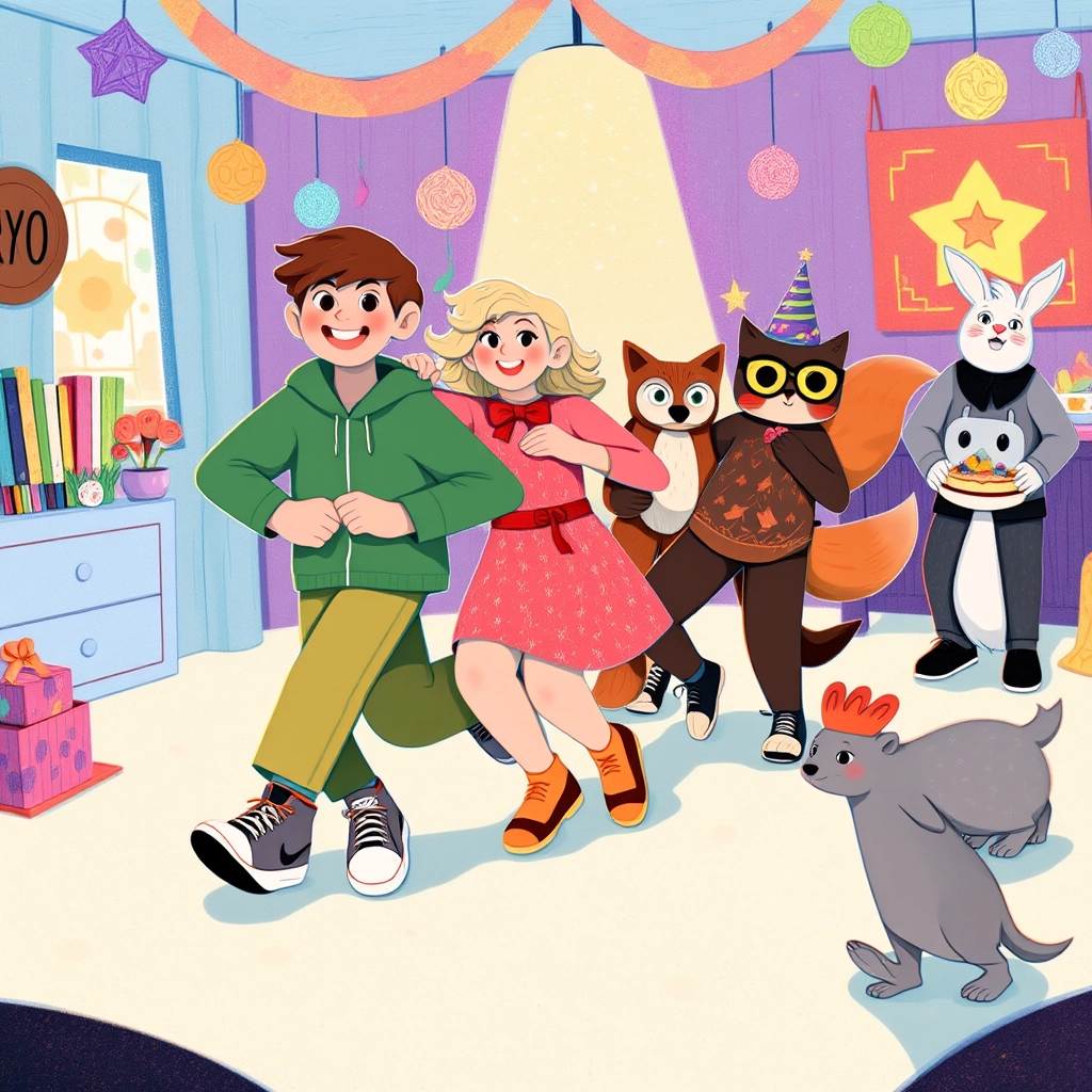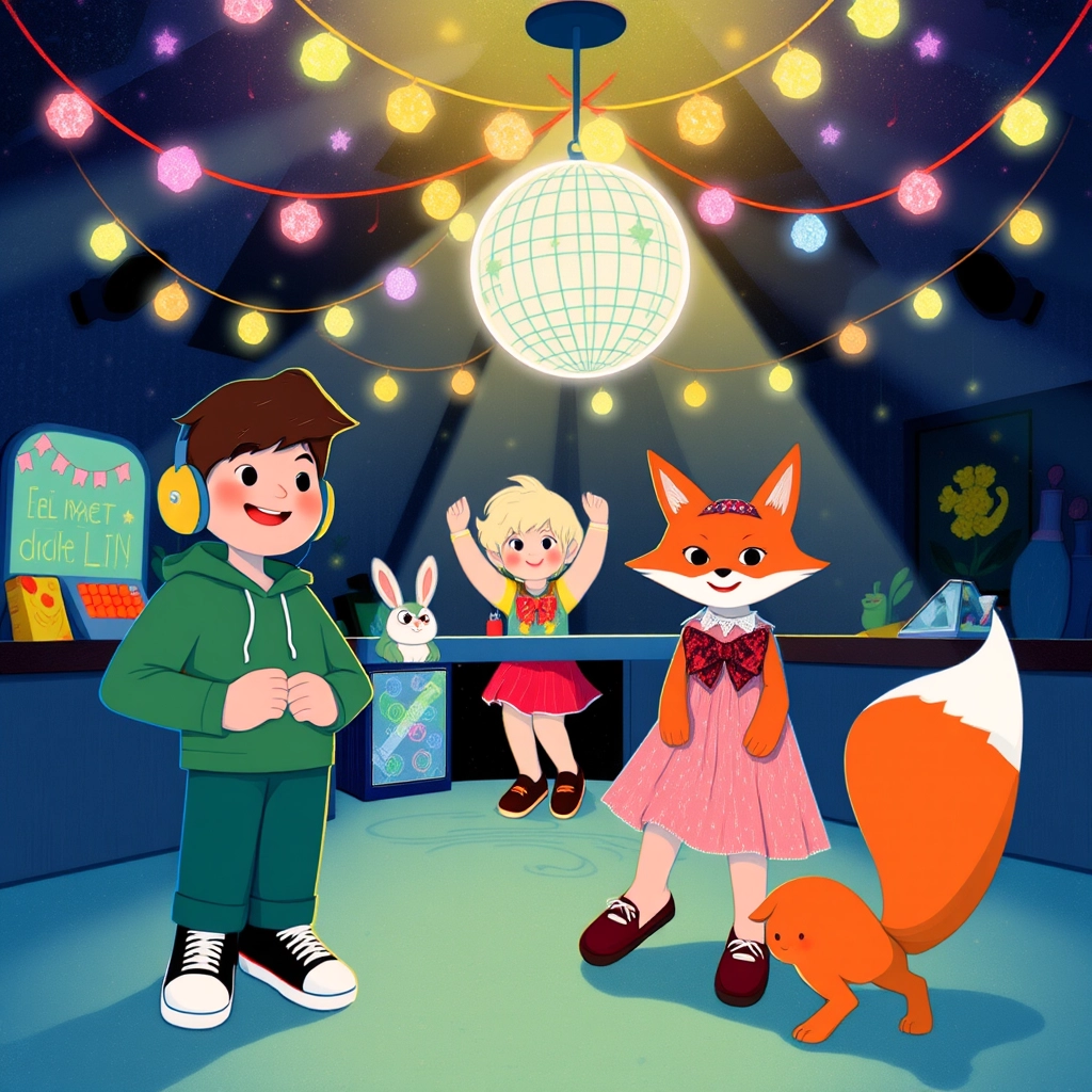 The [DJ Bunny](P7J57PGX) hopped to the stage. 'Welcome, [Dylan](HZWSKGJJ) and [Kate](43L7C372)! Tonight, you'll learn the magical dance moves of happiness!' he announced.