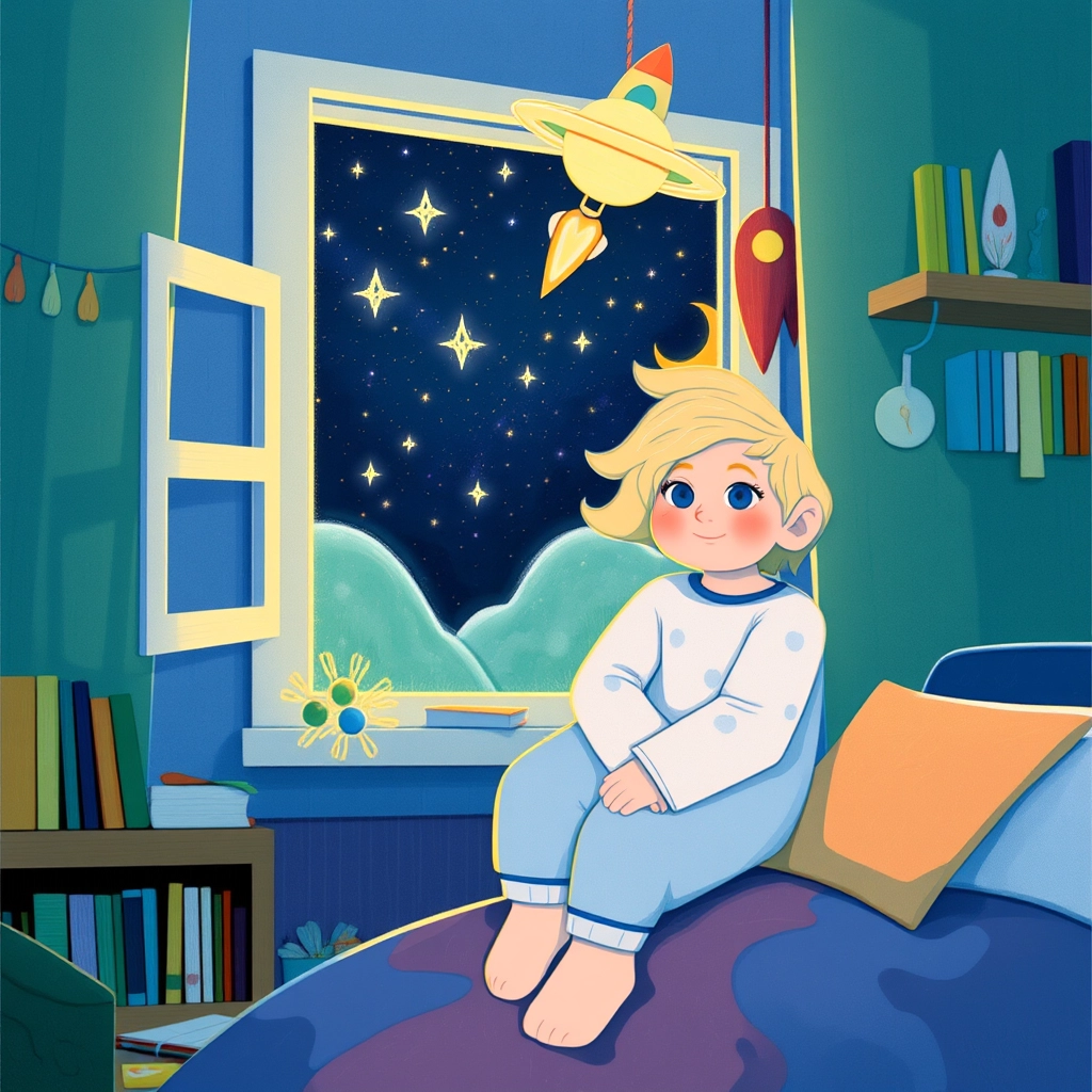[Dylan](FLMG6R3X) was a curious boy with big blue eyes and hair as golden as the morning sun. One night, as he gazed at the stars from his bedroom window, he wondered, 'What would it feel like to visit another galaxy?'