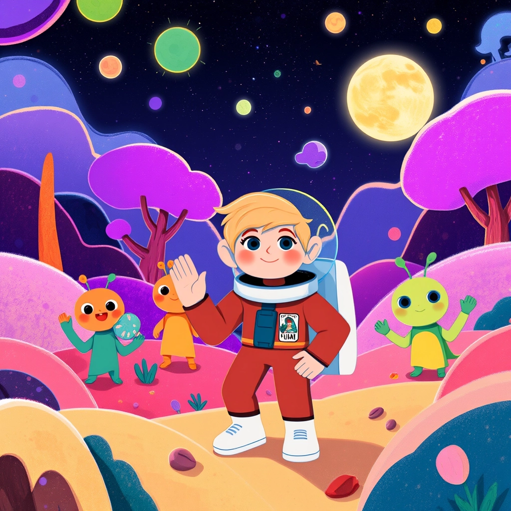Before [Dylan](FLMG6R3X) knew it, they landed on a vibrant planet filled with glowing purple trees and pink grass. Friendly aliens with round faces, big eyes, and tiny antennas waved at him. 'Welcome to Zorbinia!' one said in a giggly voice.