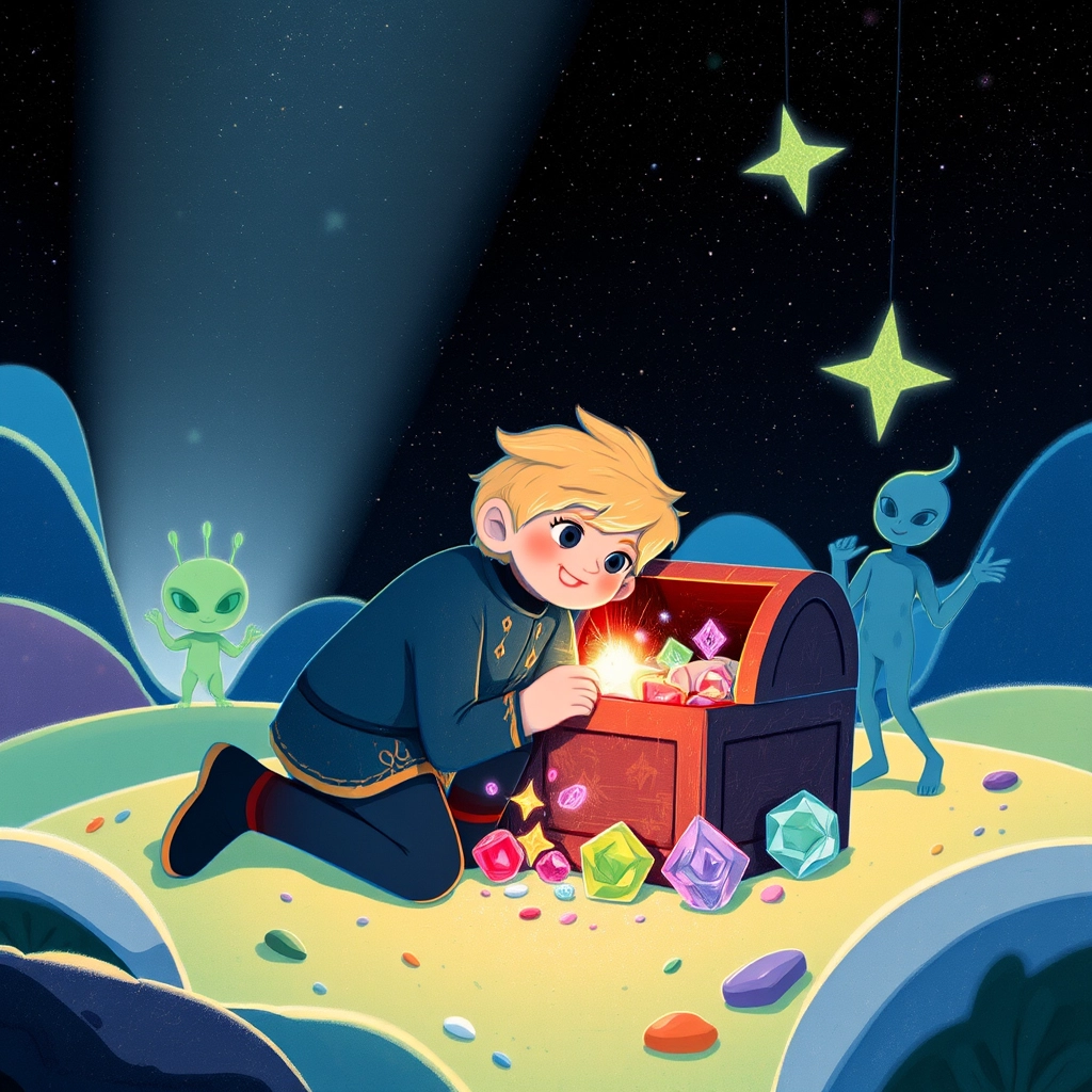 On the other side, they discovered a treasure chest hidden in the glowing rocks. Inside were swirling Galaxy Gems that held tiny miniature stars. 'You can keep one,' the aliens said. [Dylan](FLMG6R3X) picked the brightest gem and smiled.