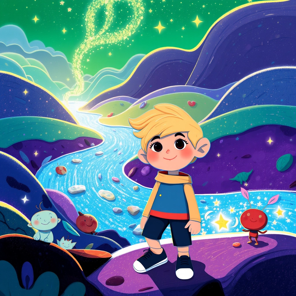 As [Dylan](FLMG6R3X) bounced, he spotted something sparkling far away. It was a river made of glittering stardust! The aliens gasped, 'That's the Stardust Stream! Only the bravest explore it!' [Dylan](FLMG6R3X) grinned. 'Let's go!'