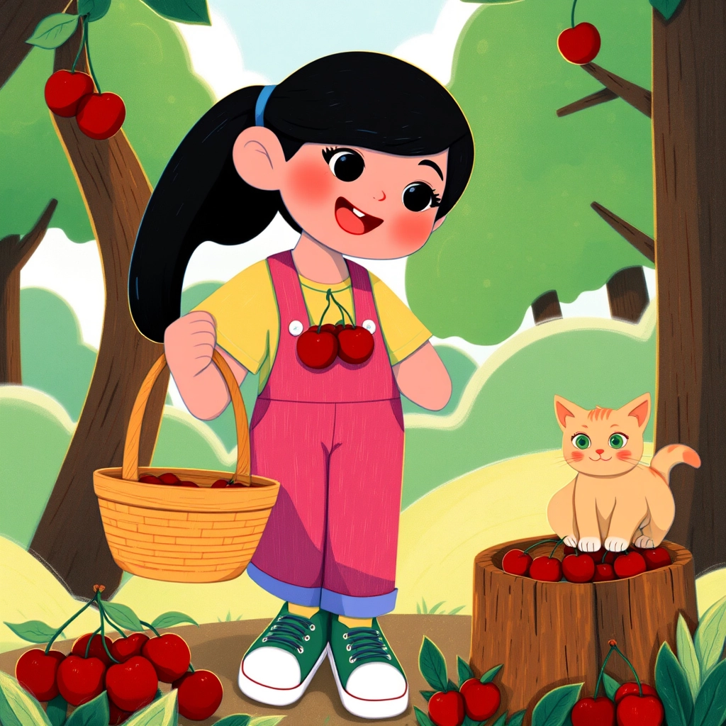 Dressed in her favorite pink overalls and yellow t-shirt, [Eemkee](KWNP6DBX) dashed outside, holding a wicker basket. The cherry orchard was ready for her.