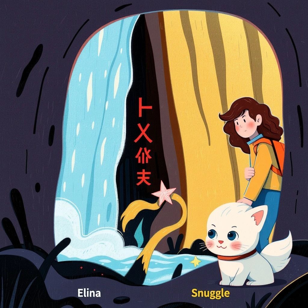 [Snuggle](5NH7PZF4) led [Elina](QPQHR6VJ) to a hidden cave at the foot of a waterfall; the sound of rushing water was both powerful and calming. Inside the cave, mysterious symbols shimmered on the walls.