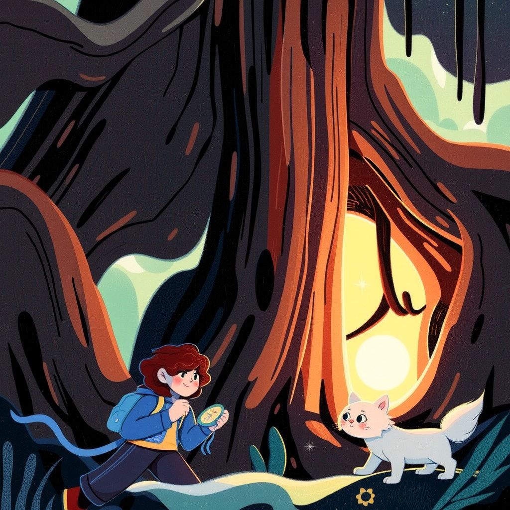 Following the map, [Elina](QPQHR6VJ) and [Snuggle](5NH7PZF4) reached the giant, ancient tree. Its roots were like wooden snakes, twisting and turning in every direction. They spotted something glimmering beneath them.