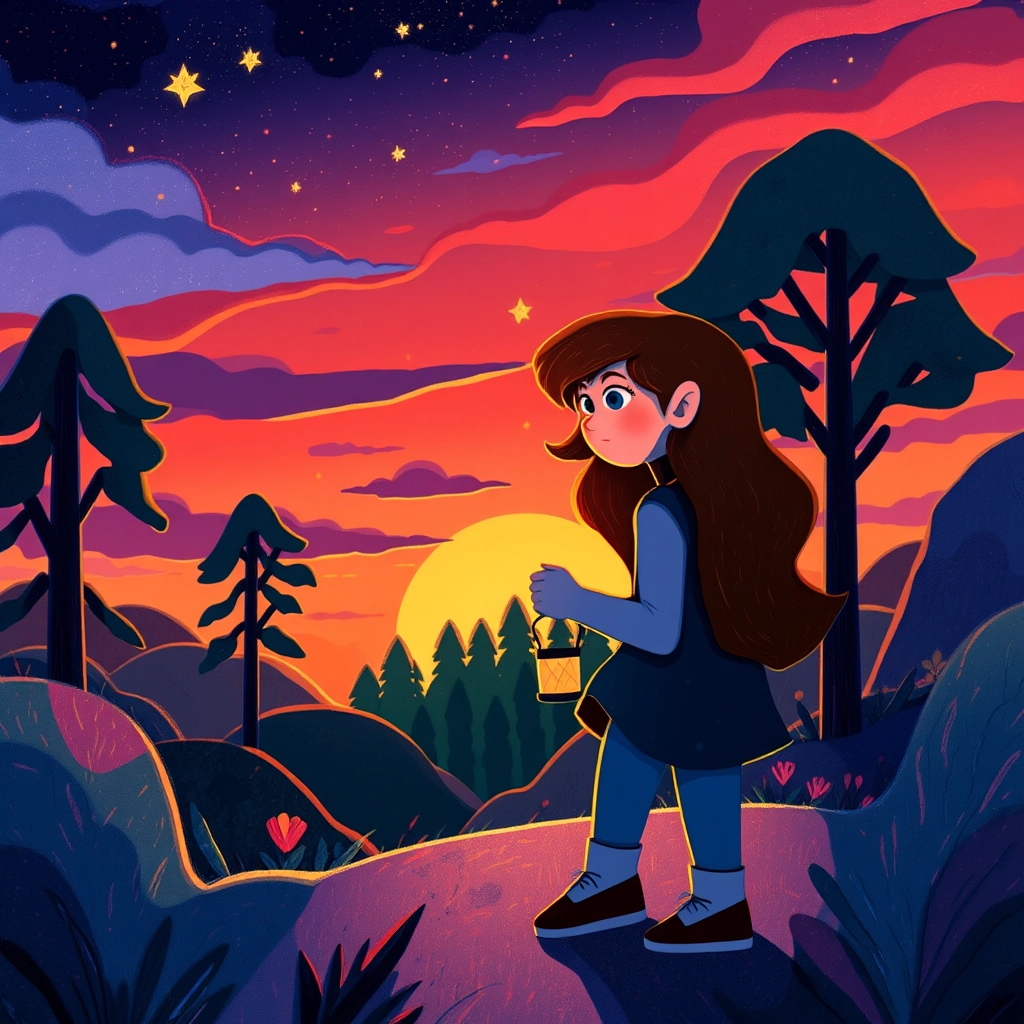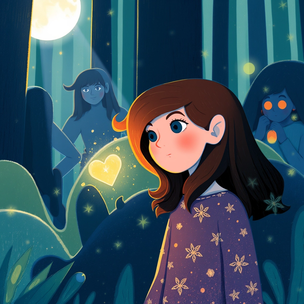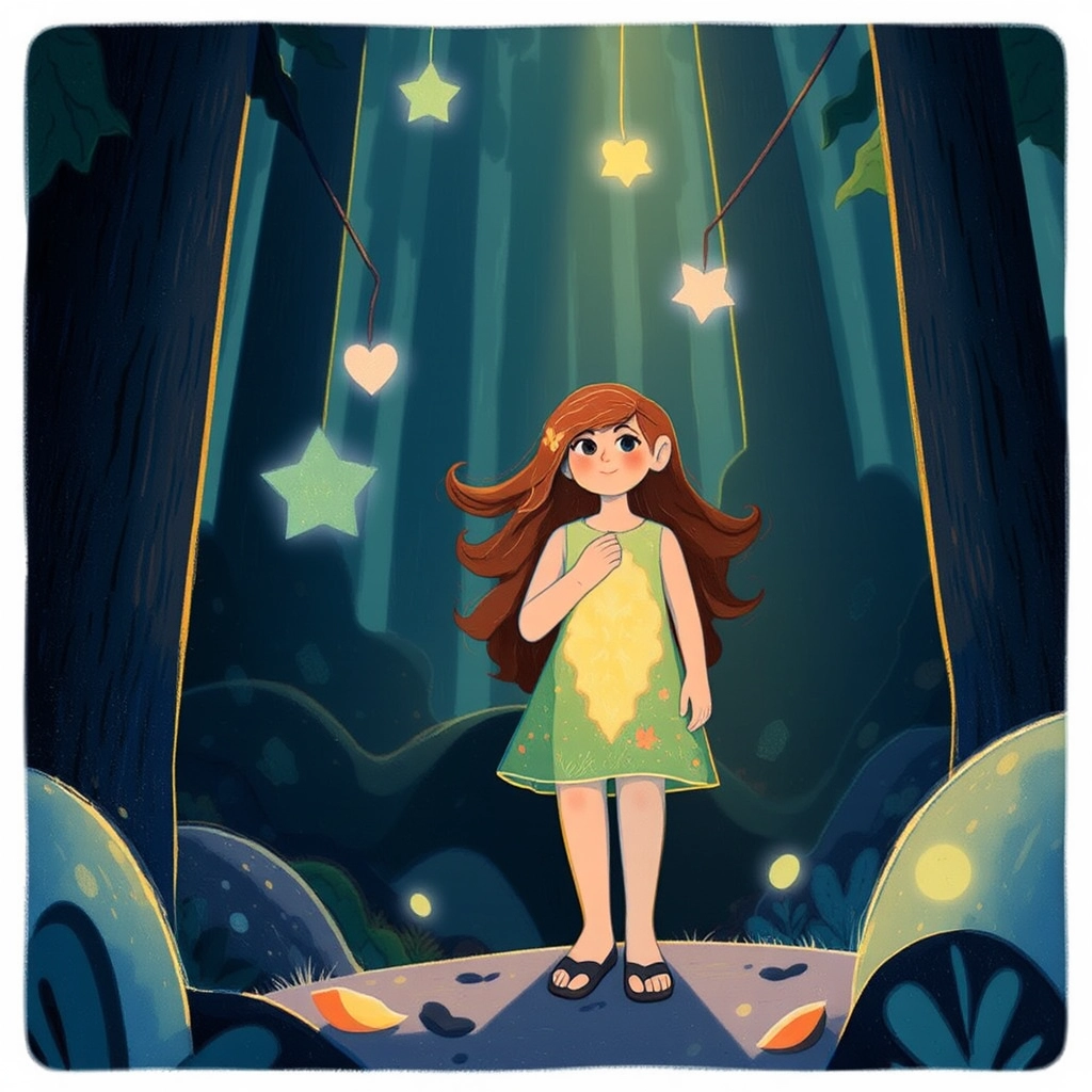 [Ella](ZSSTHQL7) couldn’t stand to see her town sink into gloom. 'I will go into the forest to find the missing light,' she decided, even though her heart beat with both courage and fear.