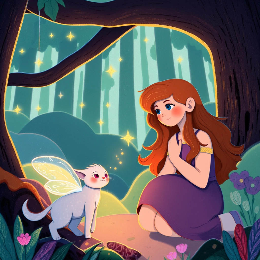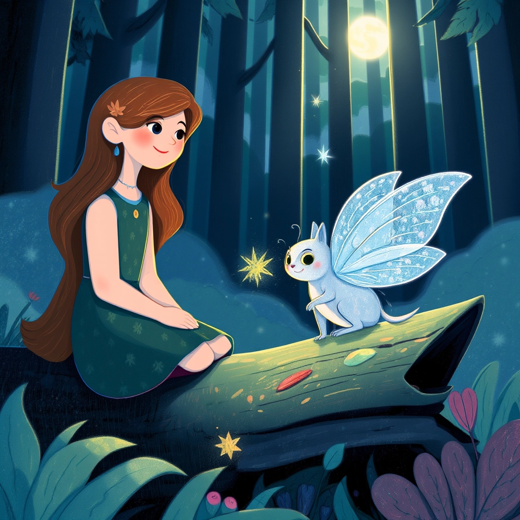 Deep in the forest, [Ella](ZSSTHQL7) met a peculiar creature with shimmering fur and tiny wings — a Shadow Sprite named [Liora](HRDCNKXC). 'Are you here to take your light back?' asked [Liora](HRDCNKXC) curiously, her dark purple eyes twinkling.