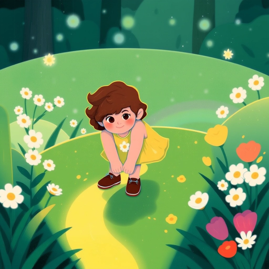 One morning, while playing in the garden, [Ella](BW5JH6SP) noticed a glowing rainbow trail leading into the woods. Curious, she waddled closer and saw tiny sparkles dancing in the air!