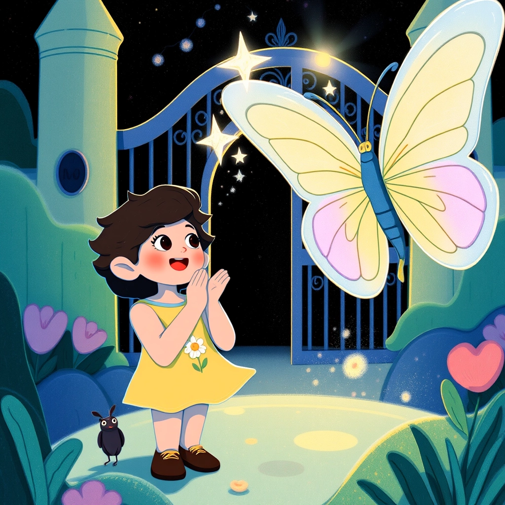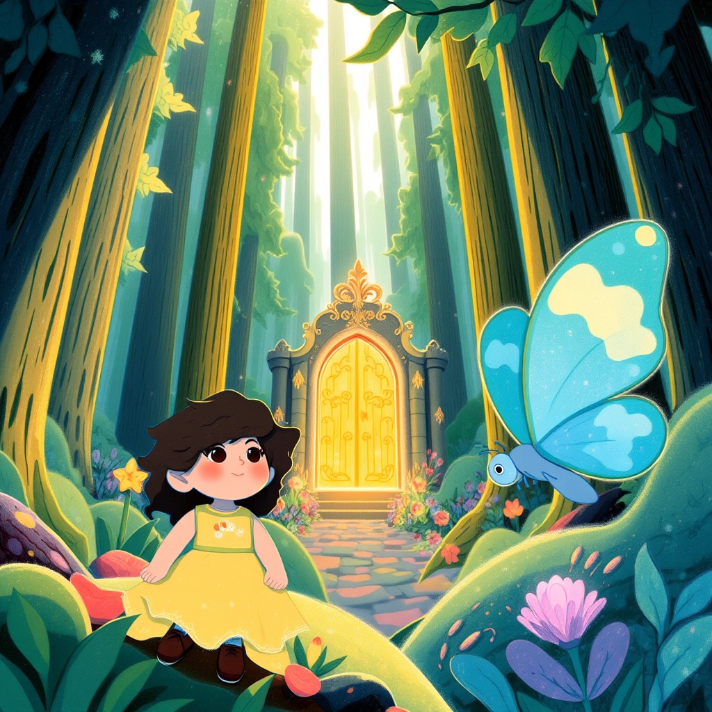 The rainbow trail led them to a clearing in the forest, where a magical gate stood shimmering with golden light. Next to the gate was a friendly talking butterfly named [Bella](V3CRRMNB).