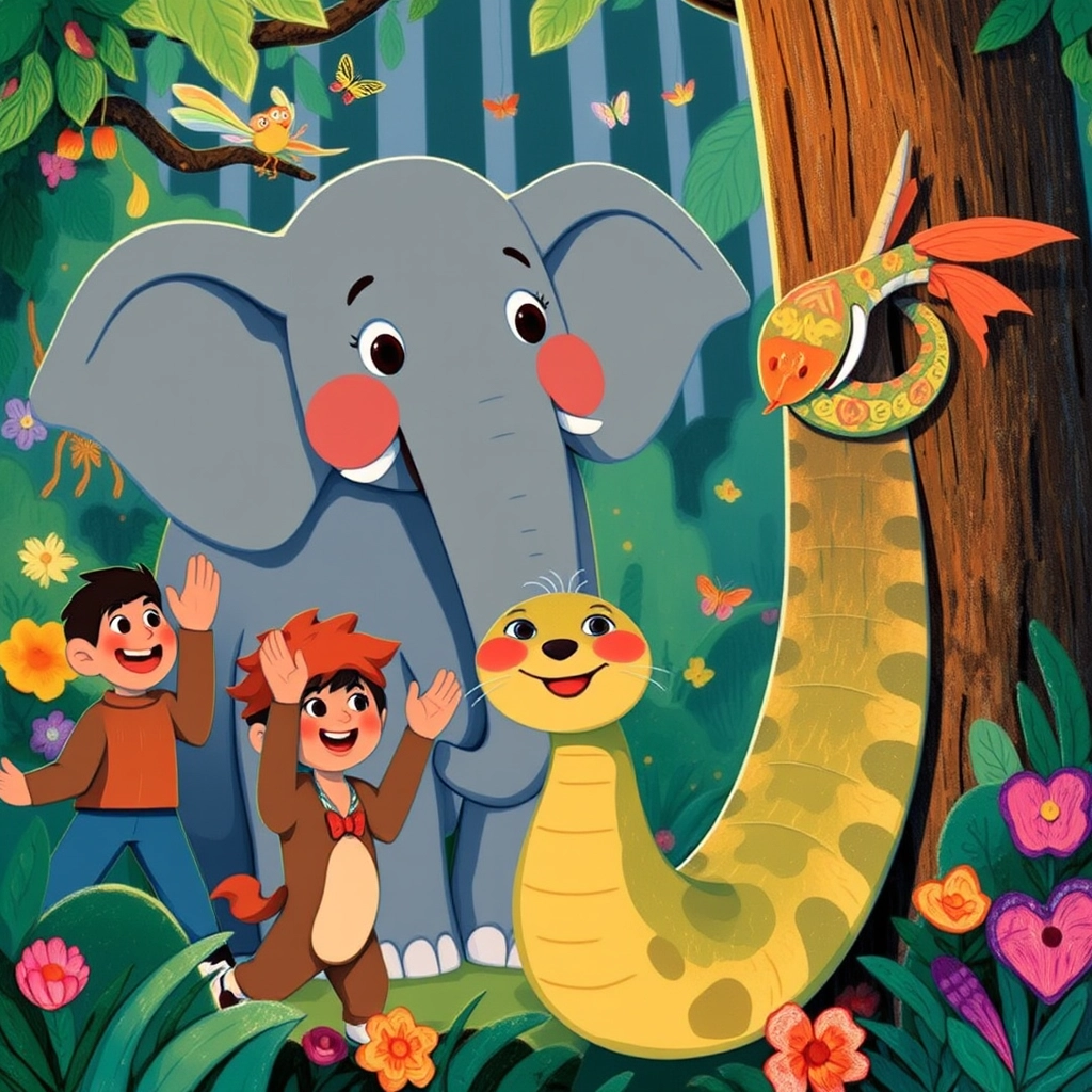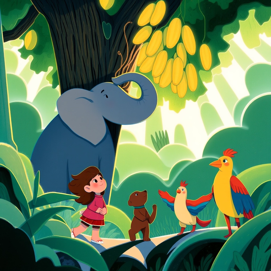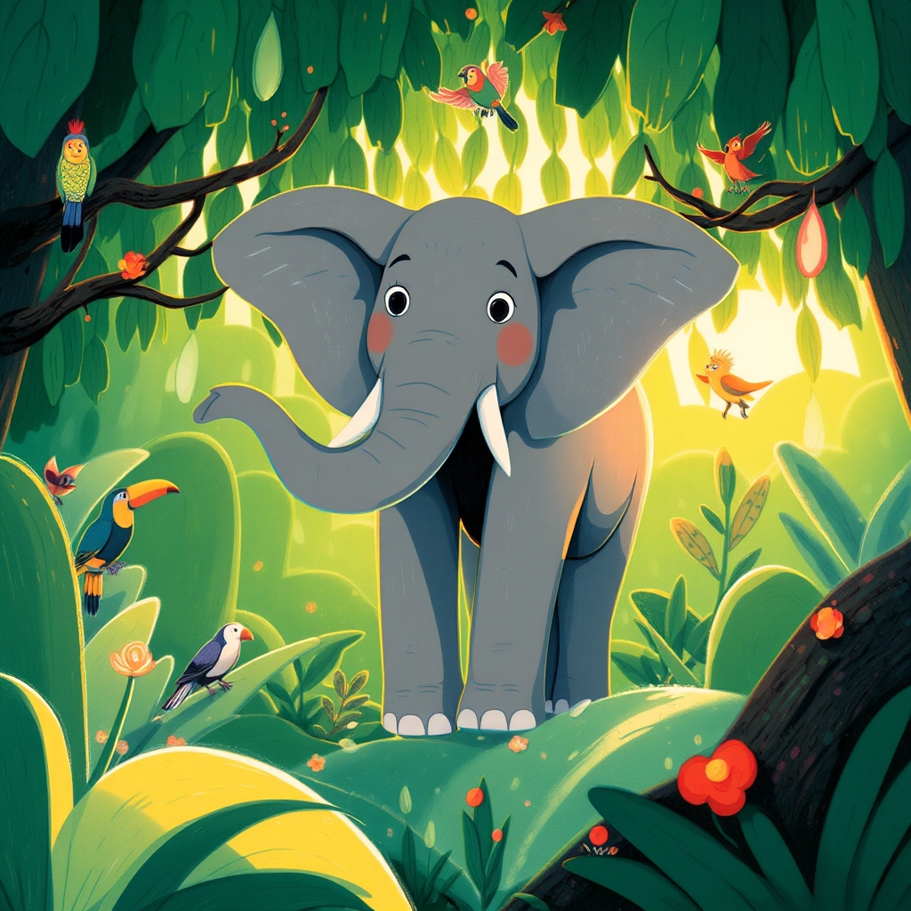 Deep in the heart of the rainforest, [Ellie](WYKWJWHS) the elephant woke up to the sound of chirping birds and the rustling of leaves. It was time to find breakfast, but today felt different—an adventure was waiting!