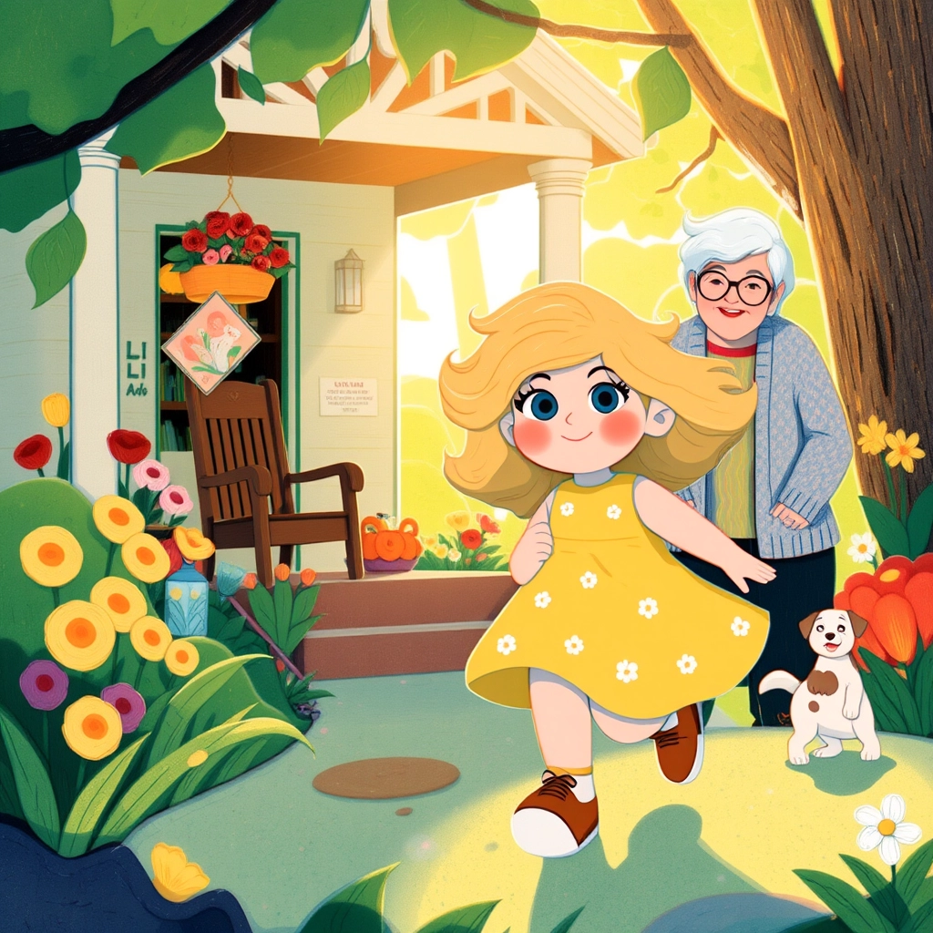 [Ellie Mae](NNN6DH4R) loved visiting [Gamma](CKFRYKQH)'s house. There was something magical about the way the sun always seemed to shine brighter there, especially when she ran up the garden path in her yellow daisy dress.