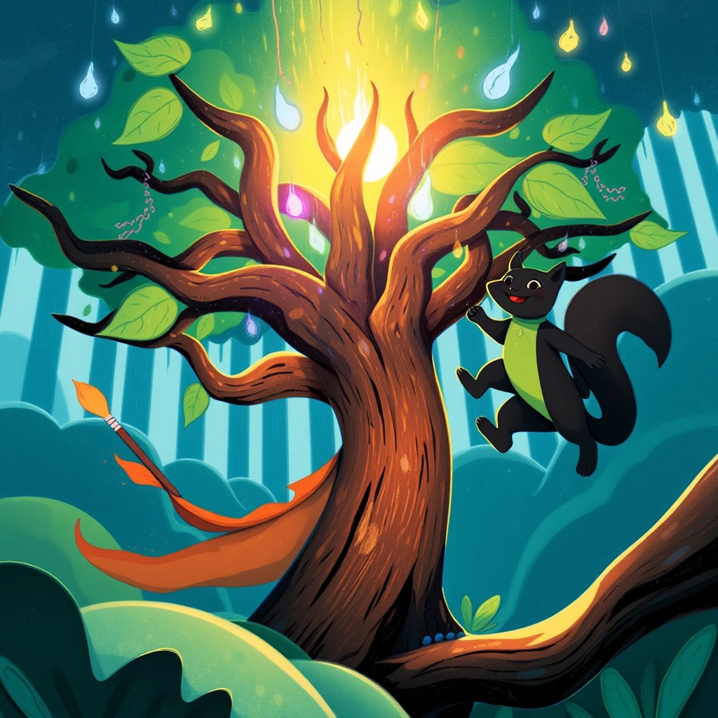 “What happened to the colors?” [Ember](VFR57JVH) wondered aloud, clutching his magical paintbrush. Just then, a cheerful black squirrel with a fluffy tail and a green shirt dashed over. “I think the forest needs your help!” said [Nutters](LHCQ5PGJ).