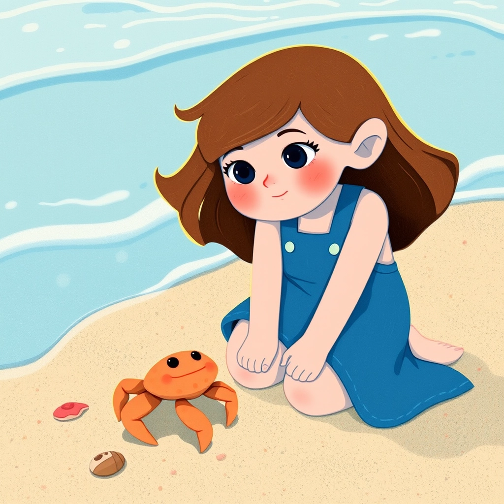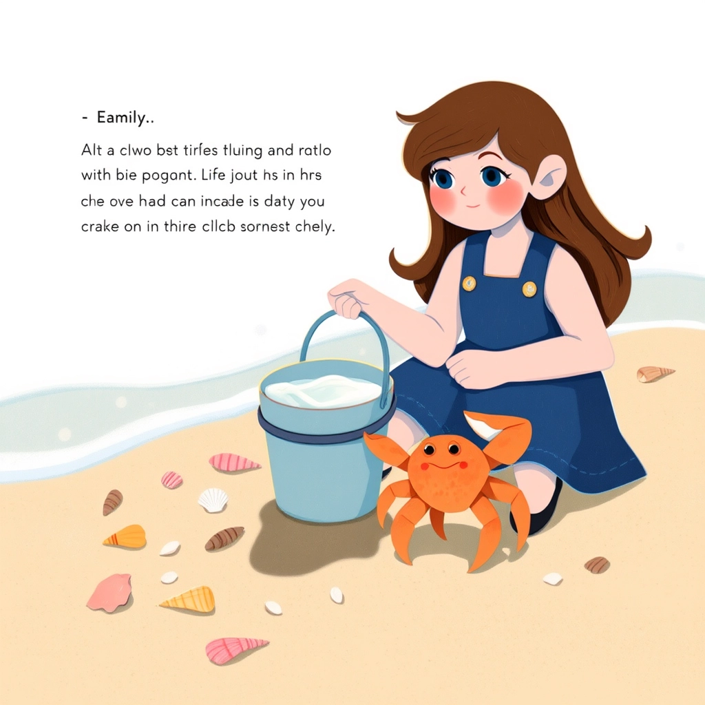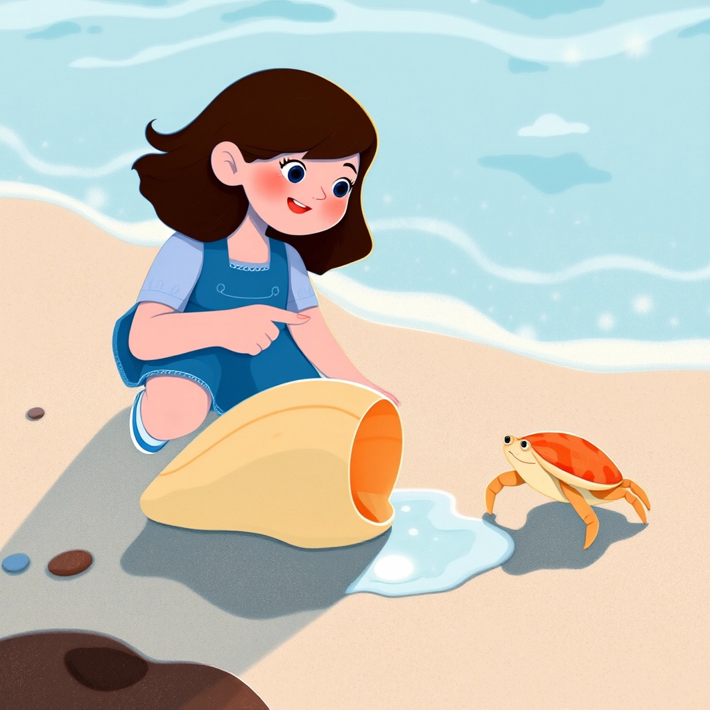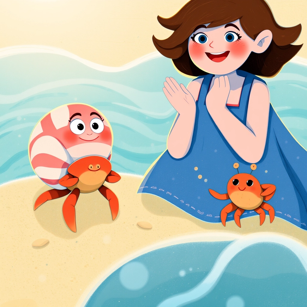 As [Emily](TX3MYPCQ) was exploring, she spotted a tiny hermit crab by the water. He looked very worried. [Emily](TX3MYPCQ) crouched down and said, 'Hello, little crab! Are you okay?'