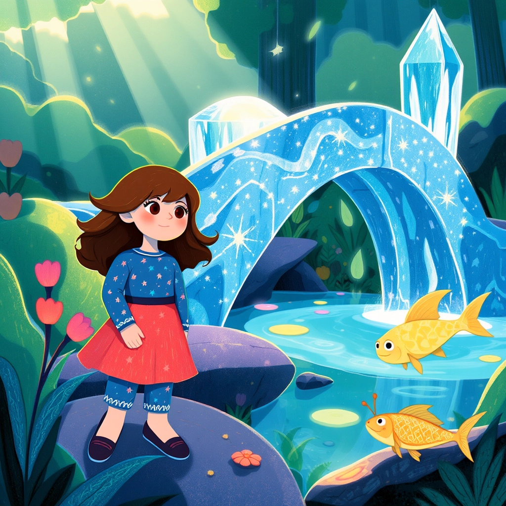 As the pebble sank, the pond lit up like a glittering mirror. Out from the water rose a bridge made of sparkling blue crystals, glistening in the sunlight. 'The Crystal Bridge appears for those looking for magic!' exclaimed [Glimmer](DCRK6GCP).