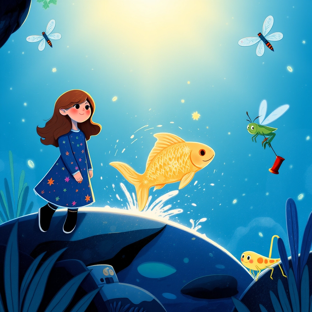 The path led them to a shimmering pond where dragonflies danced like jewels in the air. Suddenly, the water rippled, and a glowing fish jumped out. 'Welcome, [Emma](QKPD6QJ2),' said the fish, 'I am [Glimmer](DCRK6GCP), the magical pond guardian.'