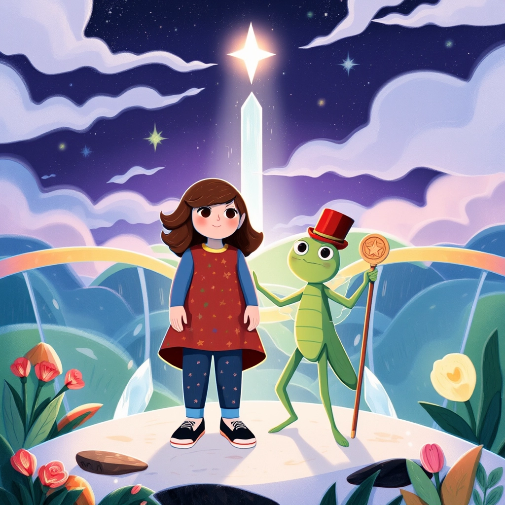 As [Emma](QKPD6QJ2) bent down to sniff a daisy, she heard a tiny voice say, 'Hello!' To her surprise, there was a small, green grasshopper wearing a shiny red top hat and holding a golden cane. 'My name is [Sir Hopsalot](4ZD7PT6Y),' said the grasshopper bowing politely.