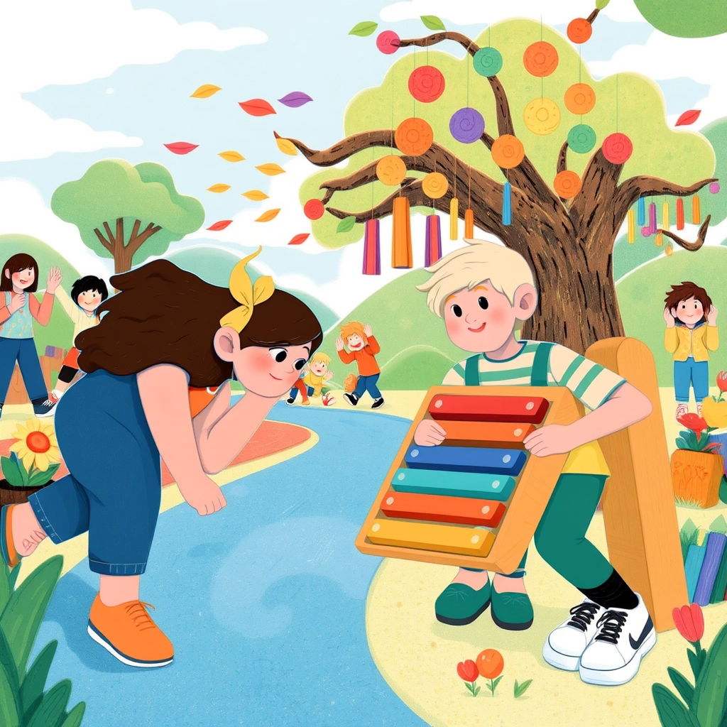 [Sam](MQ2VTPX5) shared, 'Sometimes, too many things make me feel wiggly inside!' [Emmy](ZZBBX7CC) smiled, 'Me too. But this park makes my heart happy.' Together, they discovered more fun parts of the park and found they weren’t so different after all.