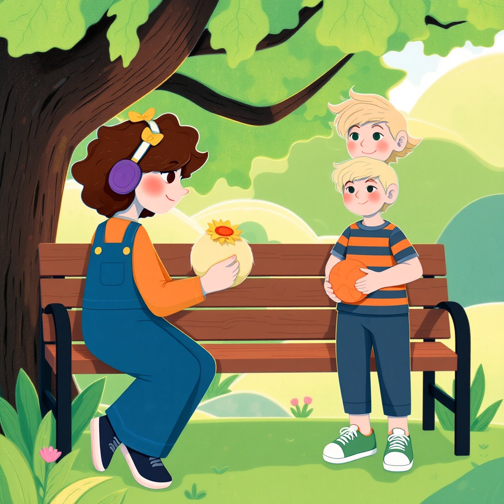 When a big crowd arrived at the park, [Emmy](ZZBBX7CC) felt overwhelmed. Her breathing got faster, so she quickly found a quiet bench with her favorite headphones. [Sam](MQ2VTPX5) joined her and handed her a fluffy sensory ball.