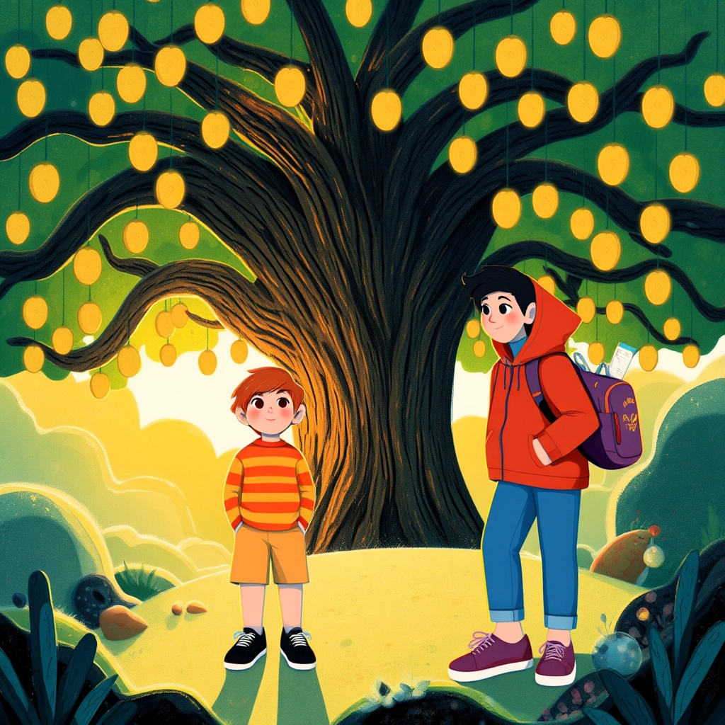 Across the bridge, they found a clearing with an ancient tree glowing golden. 'Whoa, it’s the Lost Treasure Tree!' [Ben](GH6JF3VF) whispered. Fruit shaped like gold coins hung from its branches.