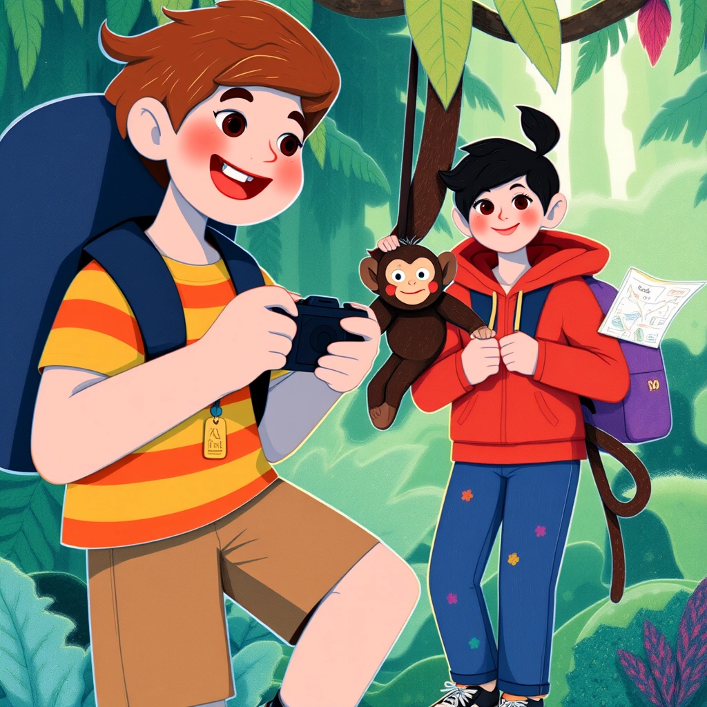 [Ben](GH6JF3VF) pulled out his camera. 'Can I take your picture?' he asked the monkey. The monkey posed with the biggest grin, and the camera clicked. 'You'll need that camera while you explore,' the monkey said.
