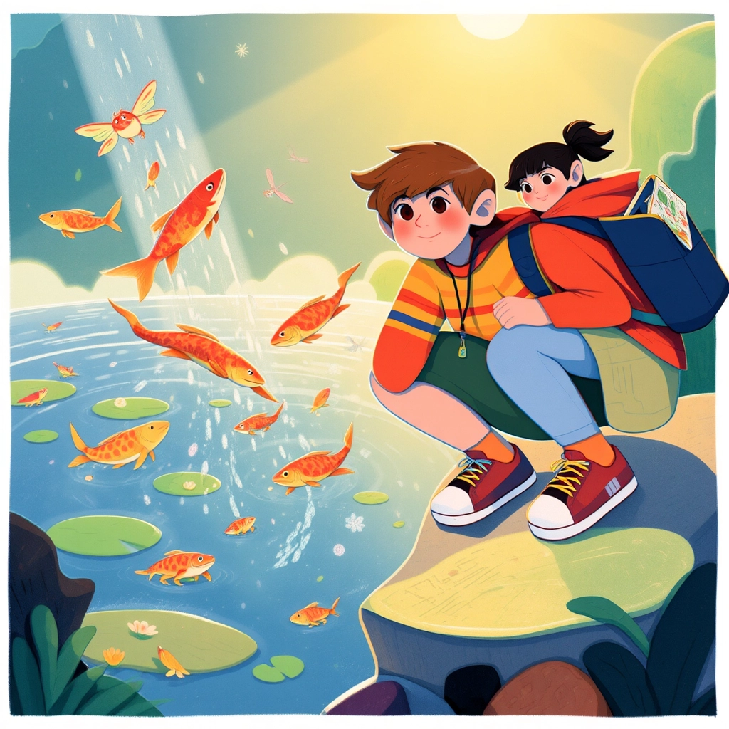 As they ventured deeper, [Emory](HL2RP9VF) pointed to a shimmering pond. 'Look at the sparkling water!' she said. Exotic fish with rainbow scales jumped in and out of the pond, as frogs sang from lily pads.