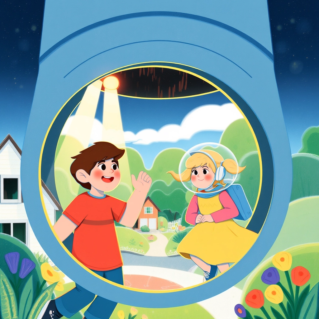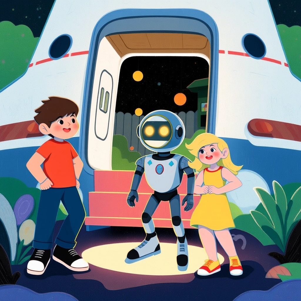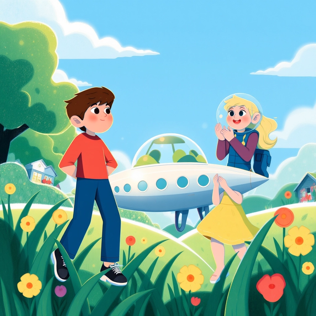 [Emory](343Z9DFF) was a curious 12-year-old boy with brown hair, and his little sister [Casey](L5L2JV4V), with shiny blonde hair, loved imagining adventures. They often sat together reading books about space and dreaming of one day exploring the stars. One day, in their backyard, they found something unexpected — a shiny, silver spaceship!