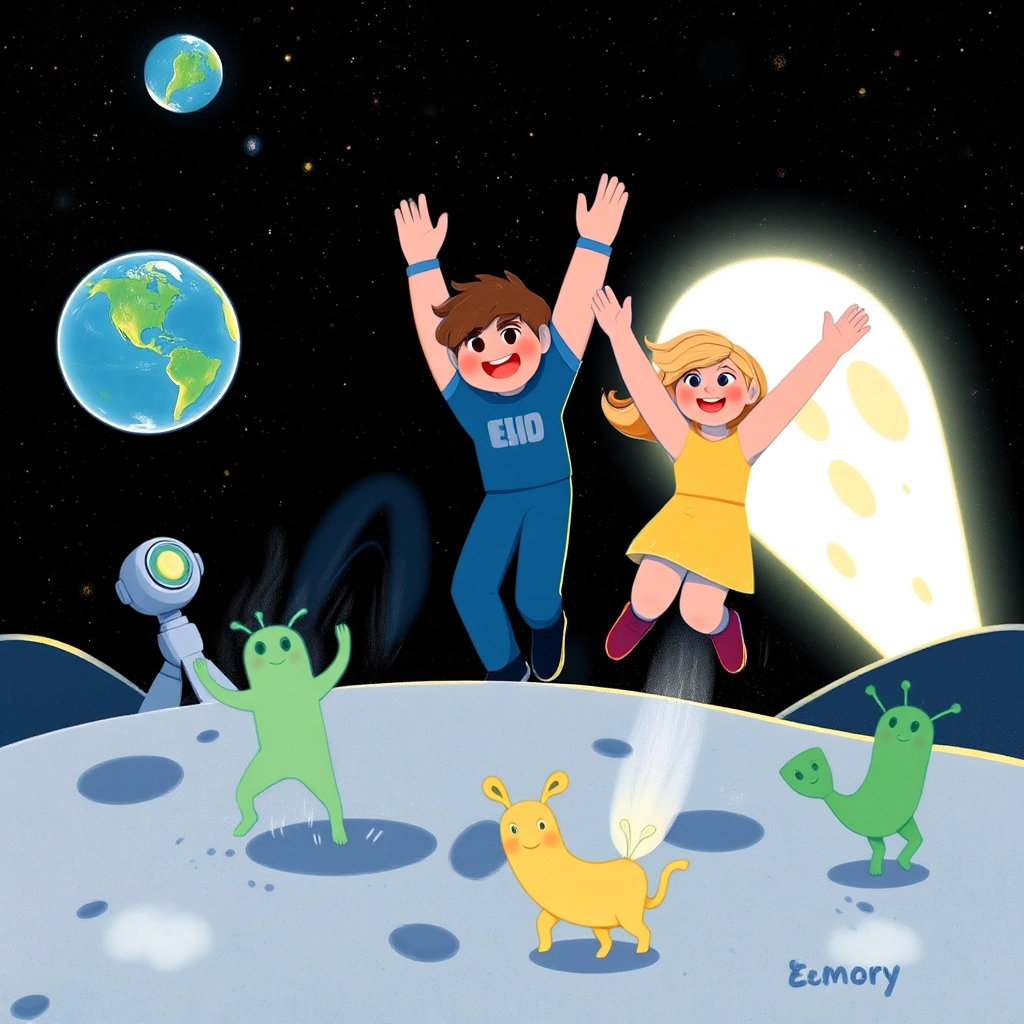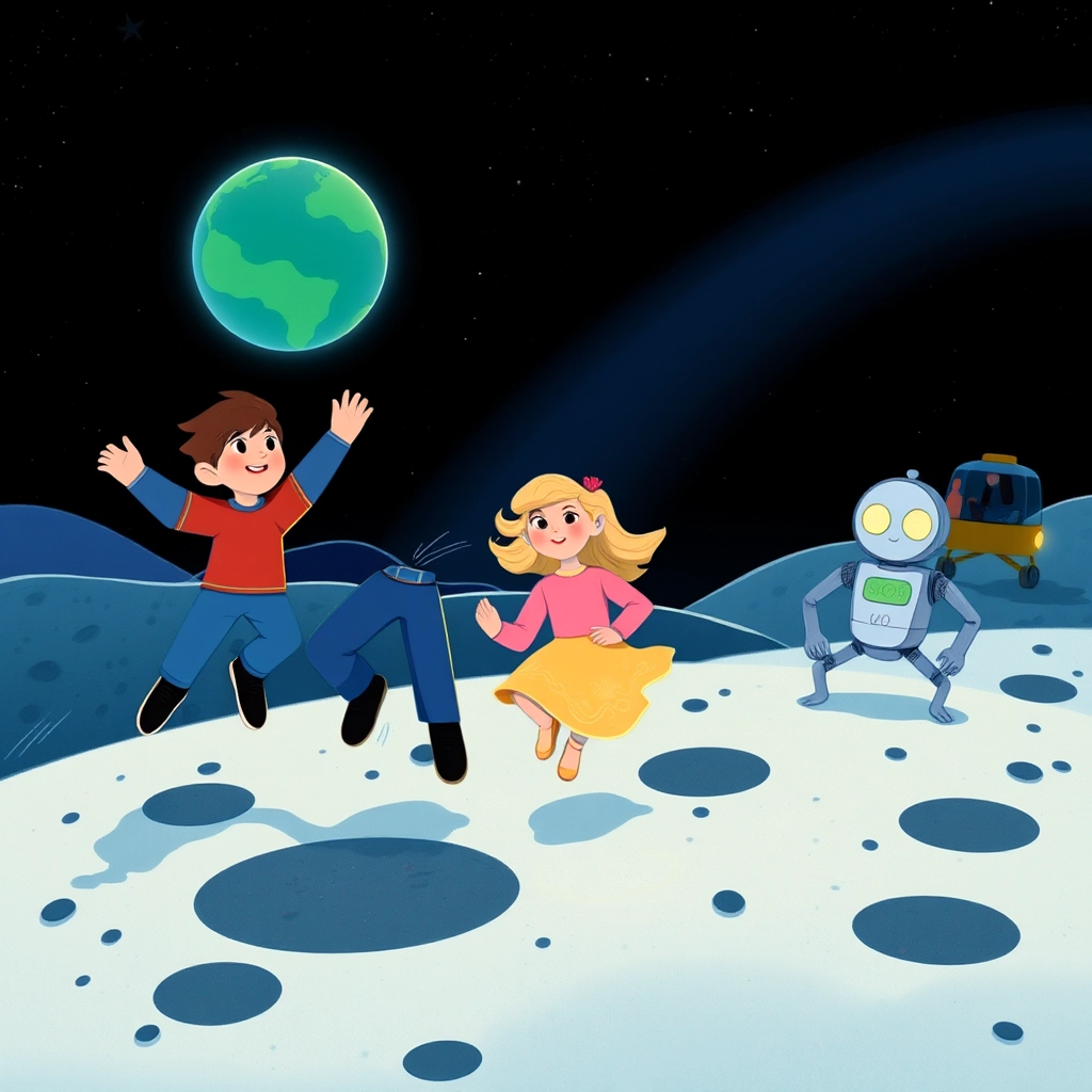 [Astro-Bot](YXLRK7WX) guided the spaceship to land on the Moon. As they walked on the powdery, gray surface, they bounced with every step because of the low gravity. 'This is so much fun!' giggled [Casey](L5L2JV4V), her blonde hair peeking out from her helmet.