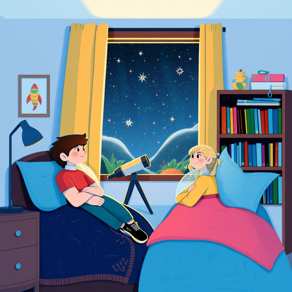 That night, [Emory](343Z9DFF) and [Casey](L5L2JV4V) looked out their bedroom window at the starry night. 'The universe is full of wonders,' said [Emory](343Z9DFF). 'And we got to explore it!' [Casey](L5L2JV4V) added with a smile. They couldn’t wait to dream of their next adventure.