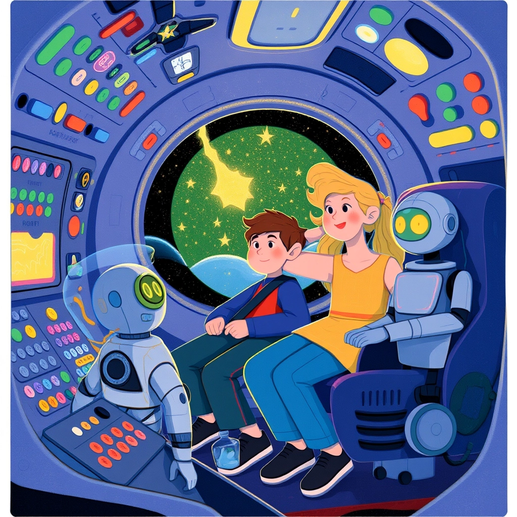Out in space, they saw planets spinning in the distance, stars twinkling like diamonds, and comets racing with fiery tails. The spaceship hummed as [Astro-Bot](YXLRK7WX) explained, 'That’s Mars, the Red Planet, and there’s Jupiter with its giant storm!'