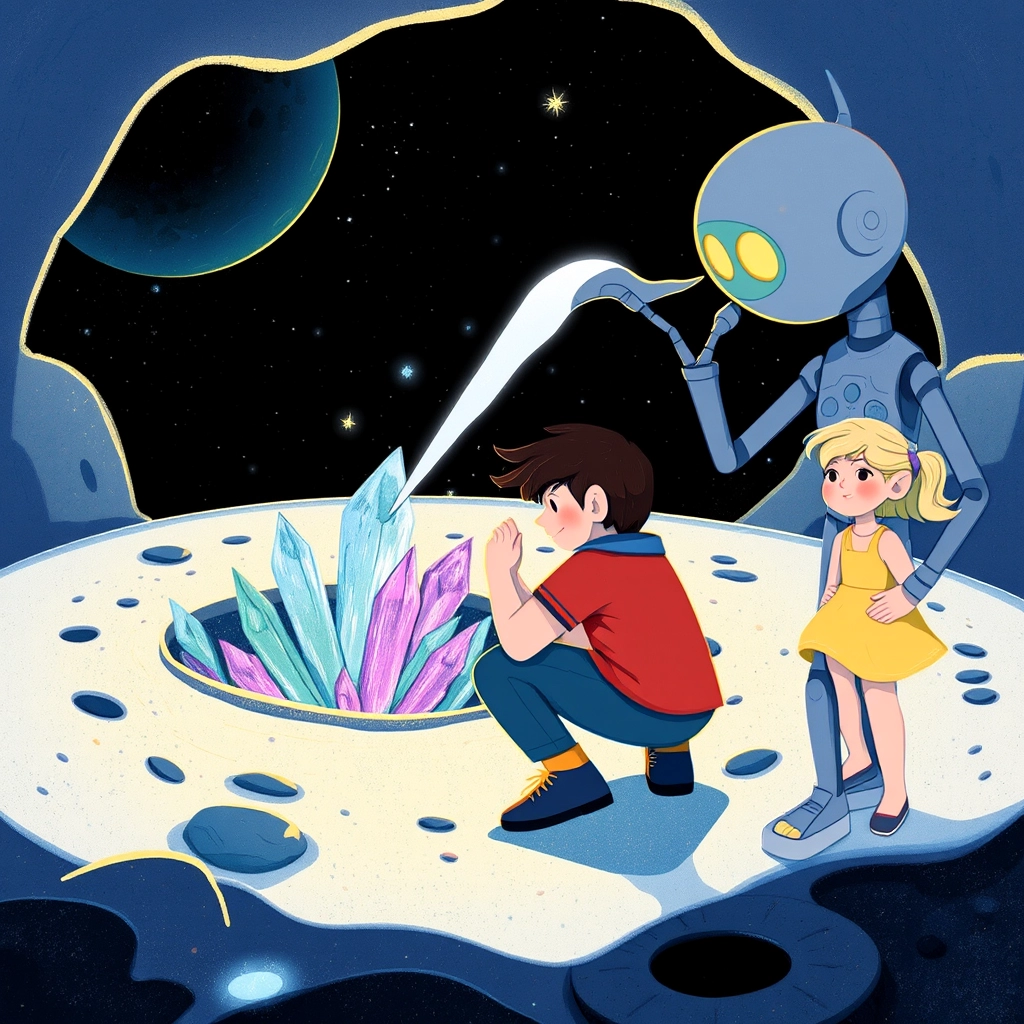 As they explored, they found something amazing — shiny crystals growing inside a small crater! 'Look at these sparkling treasures!' said [Emory](343Z9DFF). 'Do you think they’re space diamonds?' [Casey](L5L2JV4V) asked excitedly.